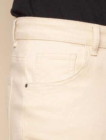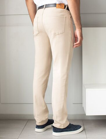 Бежевые брюки, слегка зауженные к низу, выполнили из 100% хлопкового денима. Изделие комфортно садится по фигуре, обеспечивая свободу движений. Легко сочетается со всеми цветами одежды. Модель дополнили высококачественной фурнитурой бренда.