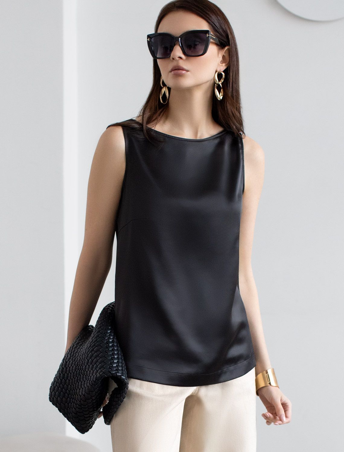Изящный нарядный топ черного цвета выполнен из нежного премиального сатина с небольшим добавлением эластана. Свободный крой обеспечивает комфорт, легкость и свободу движений, подчеркивая изысканность образа и женственность силуэта. Особое внимание привлекает мягкий приглушенный блеск материала, придающий топу дорогое и утонченное звучание. Натуральный материал отличается приятной текстурой и долговечностью, что гарантирует долгий срок службы топа. Благодаря струящейся, но плотной ткани, топ мягко ложится по фигуре, придавая легкость и подчеркивая достоинства любого типа фигуры. Приятная на ощупь текстура и хорошая воздухопроницаемость - делает повседневный топ отличным выбором для теплого времени года или для носки в помещении. Топ подойдет как на большие размеры, так и на маленькие — универсальность фасона позволяет чувствовать себя уверенно вне зависимости от комплекции. Декольте оформлено аккуратно, создавая эффектный акцент без излишней открытости.