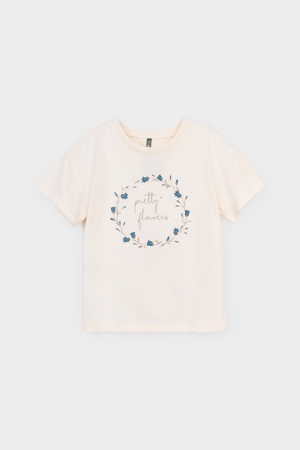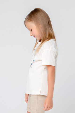Футболка для девочки из гладкого трикотажа, произведённого из высококачественного натурального хлопка. Оригинальный принт выполнен из стойких текстильных красителей. Изделие сохраняет цвет и форму после многократных стирок.