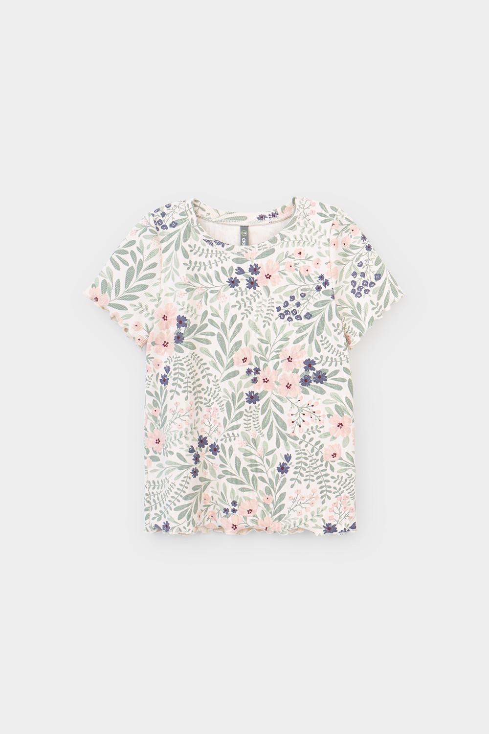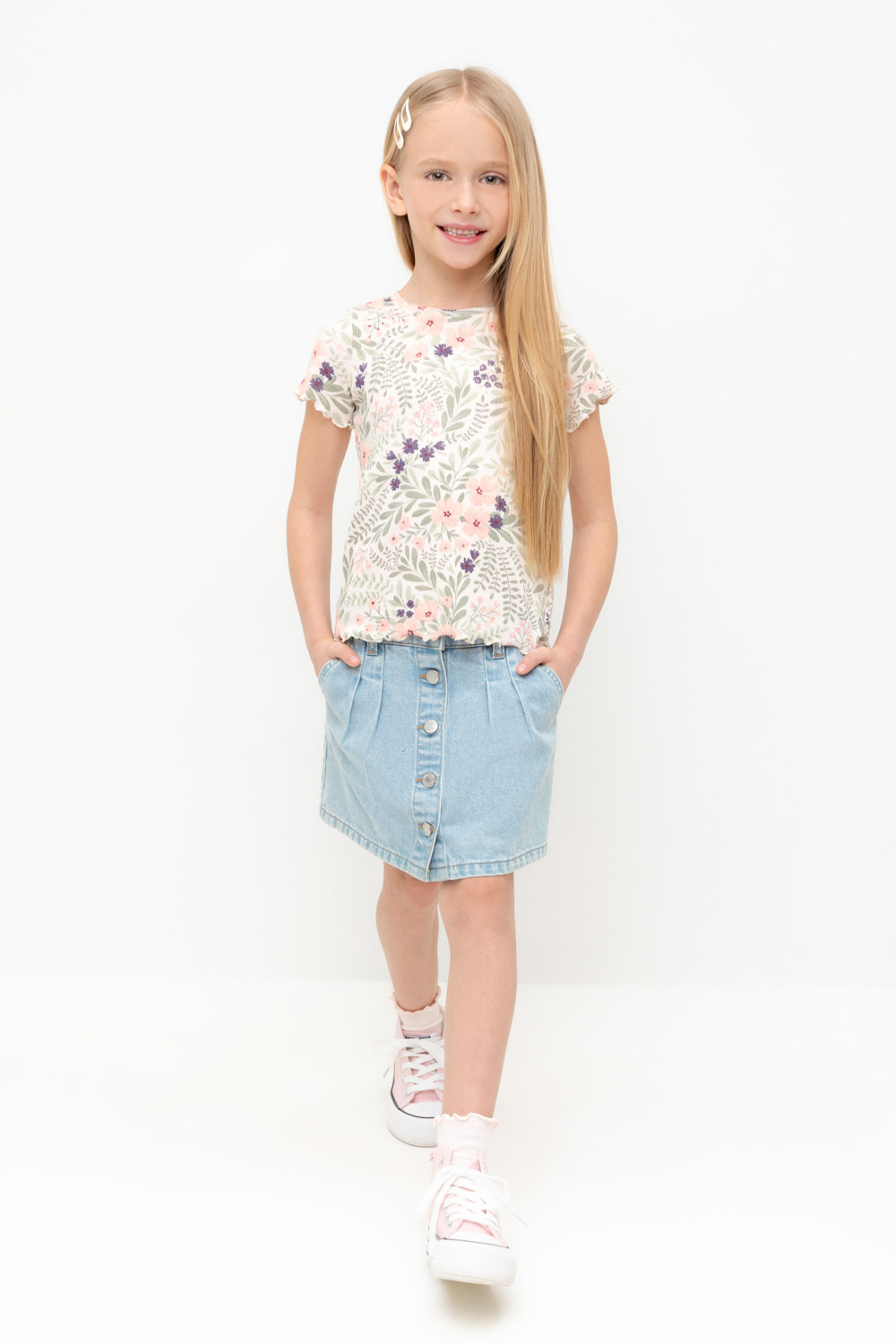 Футболка для девочки из эластичного трикотажа в рубчик. Оригинальная набивка выполнена из стойких текстильных гипоаллергенных красителей. Изделие сохраняет цвет и форму после многократных стирок.