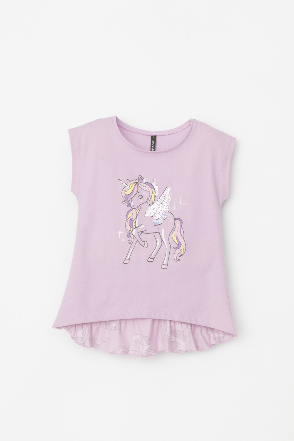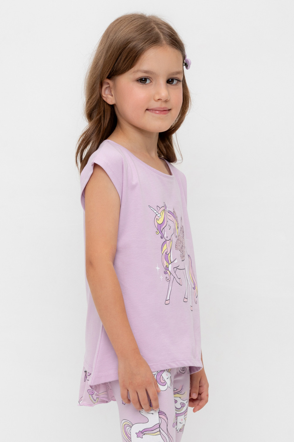 Туника для девочки из высококачественного трикотажного полотна. Оригинальные принт и набивка выполнены из стойких текстильных гипоаллергенных красителей. Для удобства одевания на плече в размерах 92 и 98 есть застежка на кнопки.
