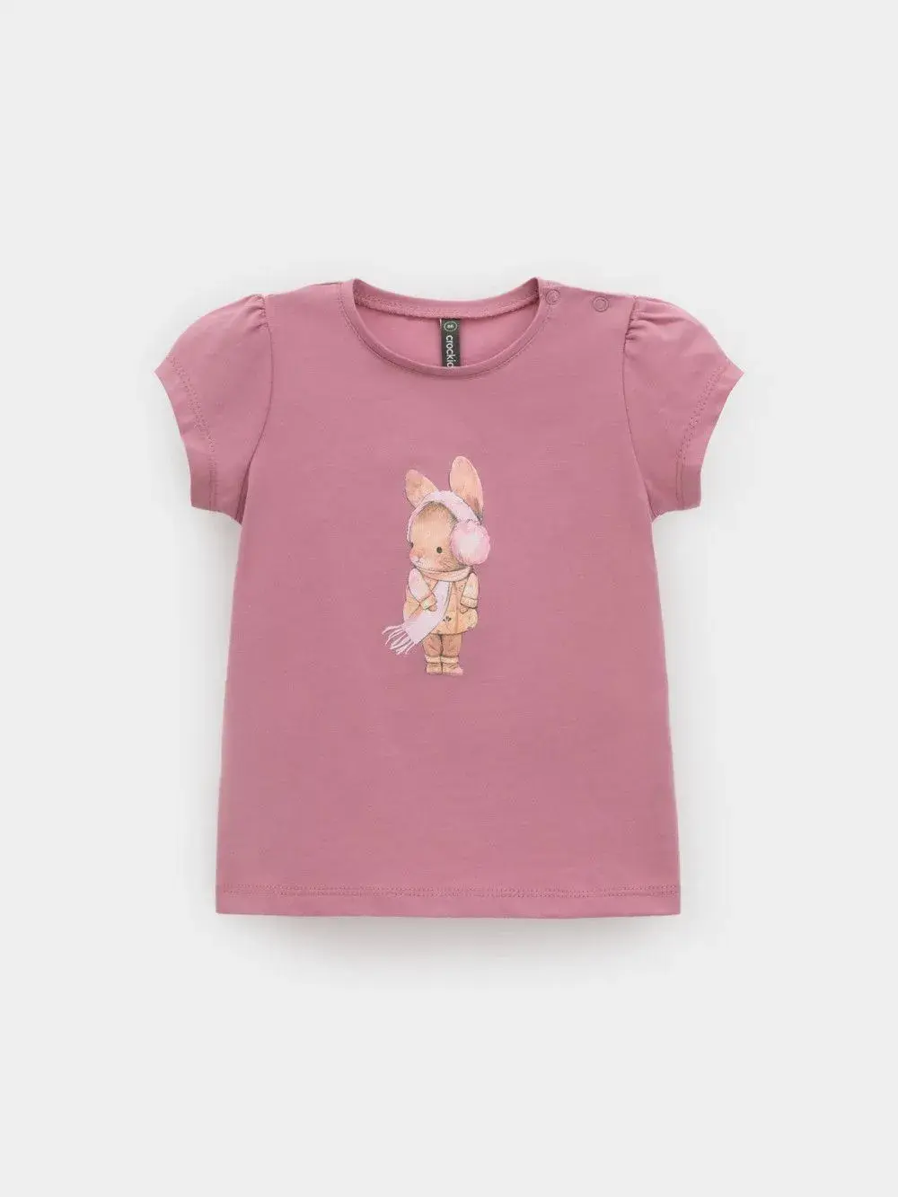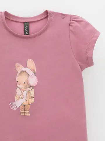 Футболка для девочки из гладкого трикотажа, произведённого из высококачественного натурального хлопка. На плече застёгивается на кнопки. Оригинальный принт выполнен из стойких текстильных гипоаллергенных красителей. Изделие сохраняет цвет и форму после многократных стирок. Все трикотажные полотна производятся в соответствии с нормами швейцарского сертификата ЭкоТекс.
