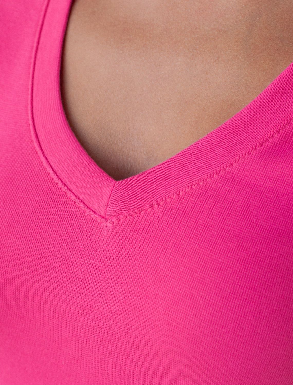 Облегающая футболка с V-образным вырезом цвета фуксия создаст утонченный образ. Идеальная базовая модель для вашего гардероба! Глубокий V-образный вырез подчеркивает линию шеи и зрительно удлиняет силуэт. Футболка выполнена из хлопка с добавлением эластана, которая мягко облегает контуры тела, подчеркивая достоинства фигуры. Универсальный вариант для создания стильных повседневных образов.