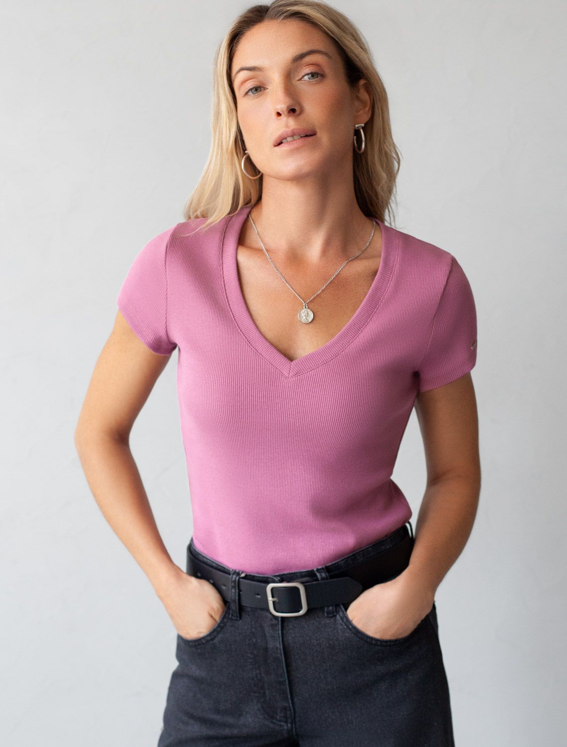 Стильная облегающая футболка грязно-розового цвета с V-образным вырезом сшита из плотного хлопкового трикотажа в рубчик с добавлением эластана, что гарантирует комфортную посадку по фигуре. V-вырез подчеркивает линию декольте, добавляя образу нотку элегантности. Практичная модель, которая не деформируется после стирок и сочетается с любым стилем одежды - от кэжуал до смарт-кэжуал.