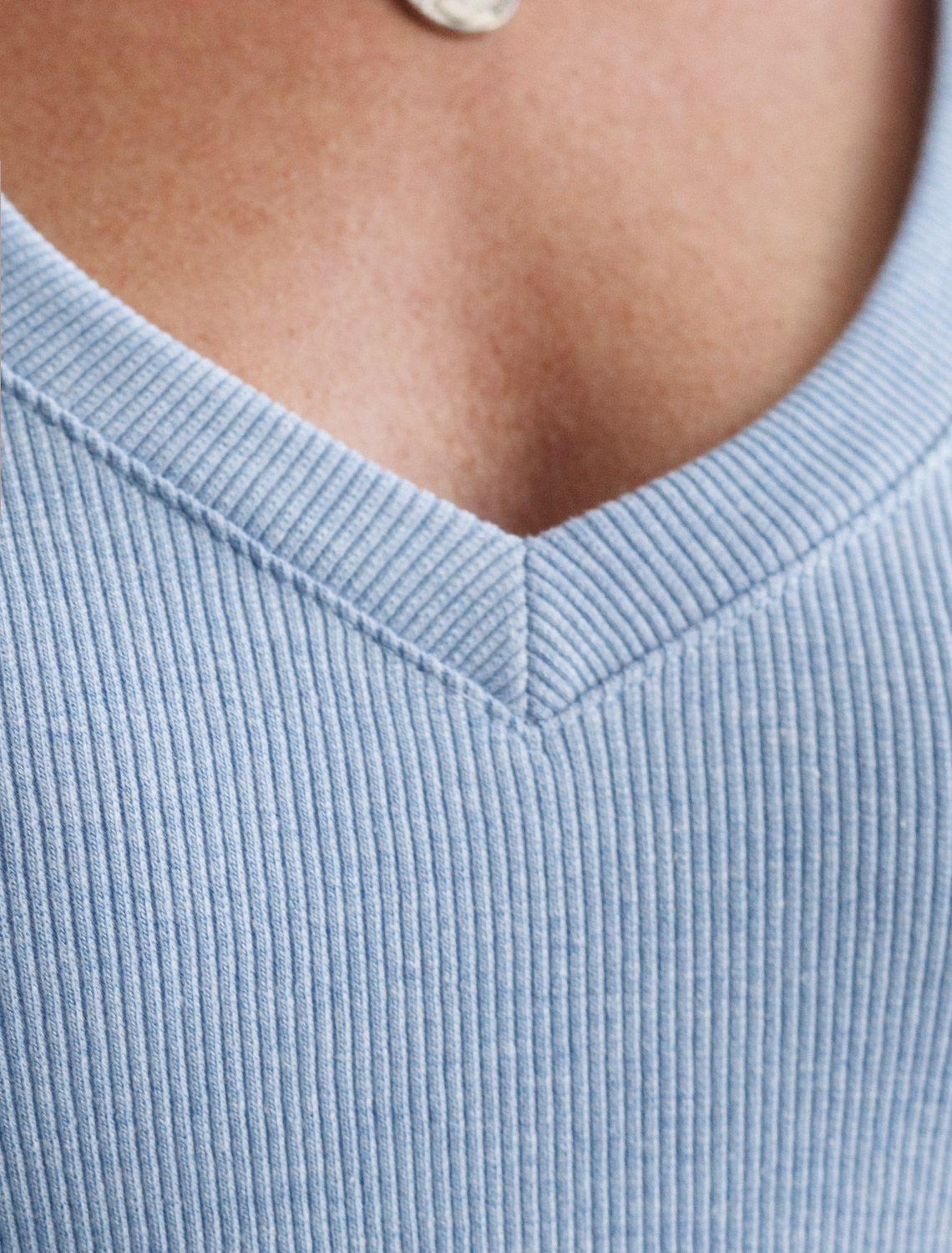 Стильная облегающая футболка в цвете голубой меланж с V-образным вырезом сшита из плотного хлопкового трикотажа в рубчик с добавлением эластана, что гарантирует комфортную посадку по фигуре. V-вырез подчеркивает линию декольте, добавляя образу нотку элегантности. Практичная модель, которая не деформируется после стирок и сочетается с любым стилем одежды - от кэжуал до смарт-кэжуал.
