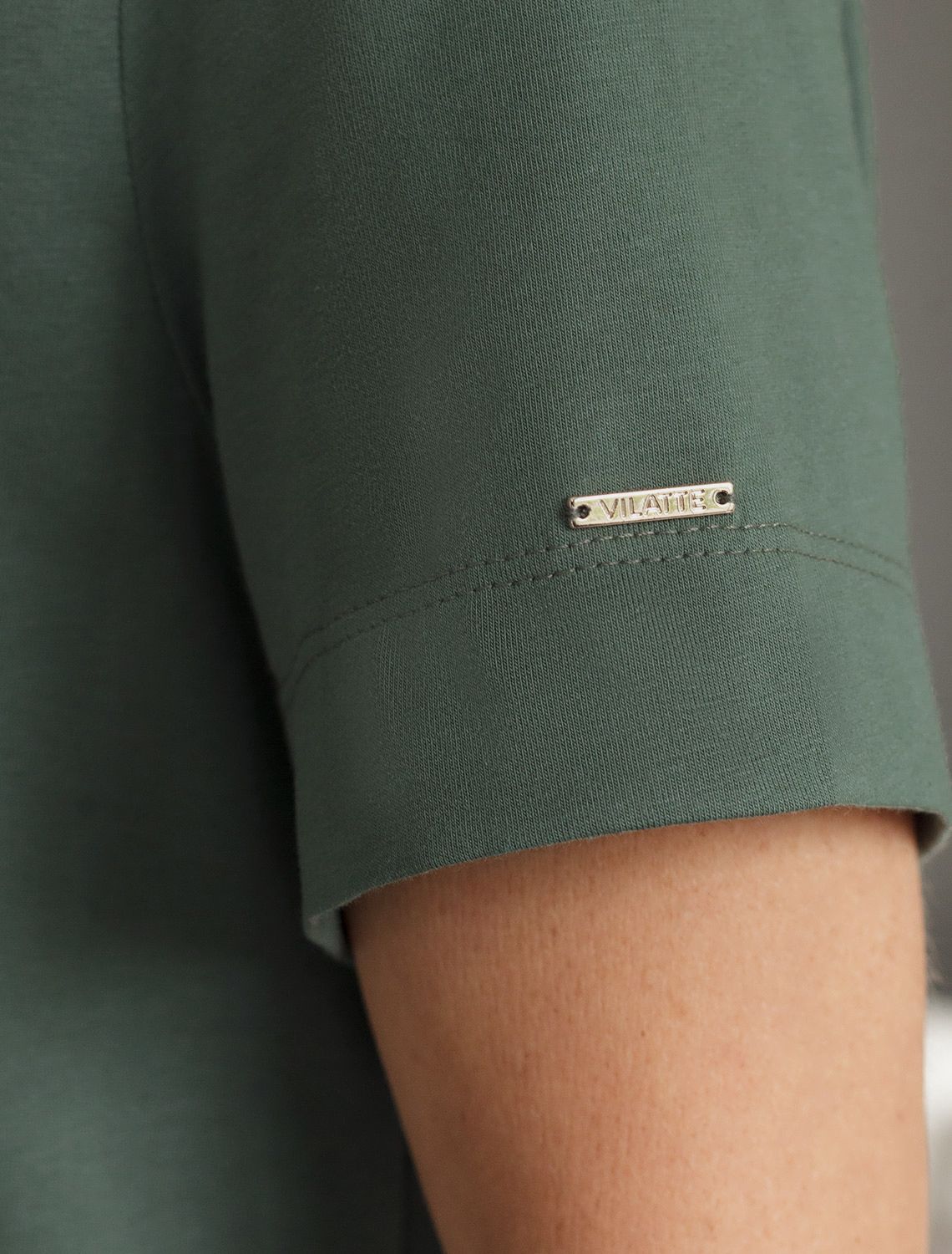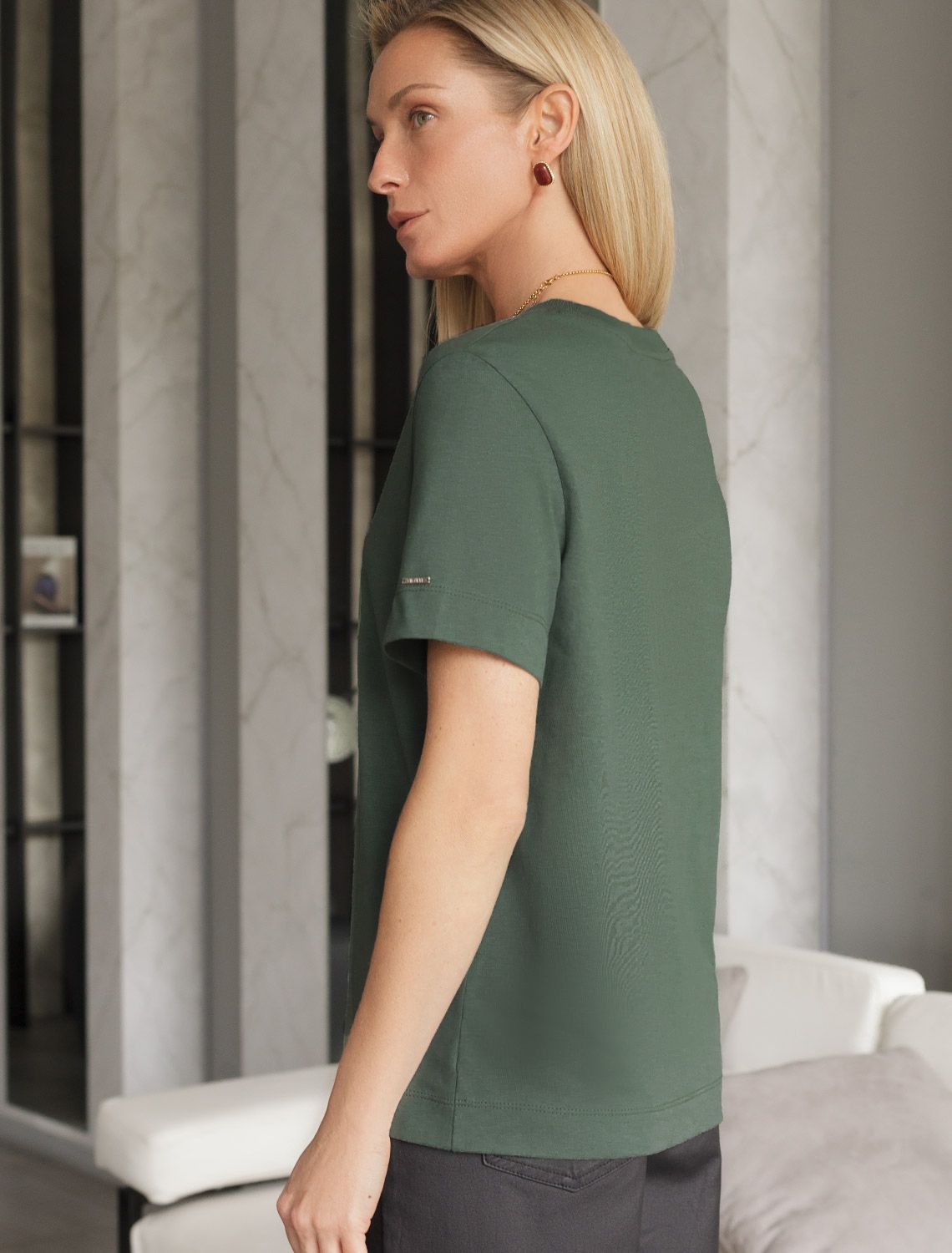 Базовая однотонная футболка из премиального хлопка. Горловина выполнена из рибаны в тон изделия, Добавление эластана в состав изделия способствует формоустойчивости. Самое высокое качество хлопковых волокон обеспечивает комфорт в любое время года. Идеально держит форму и сохраняет внешний вид в течение долговременного использования. Универсальная базовая вещь для ваших стилистических решений. Изделие дополнено металлическим логотипом бренда на рукаве.