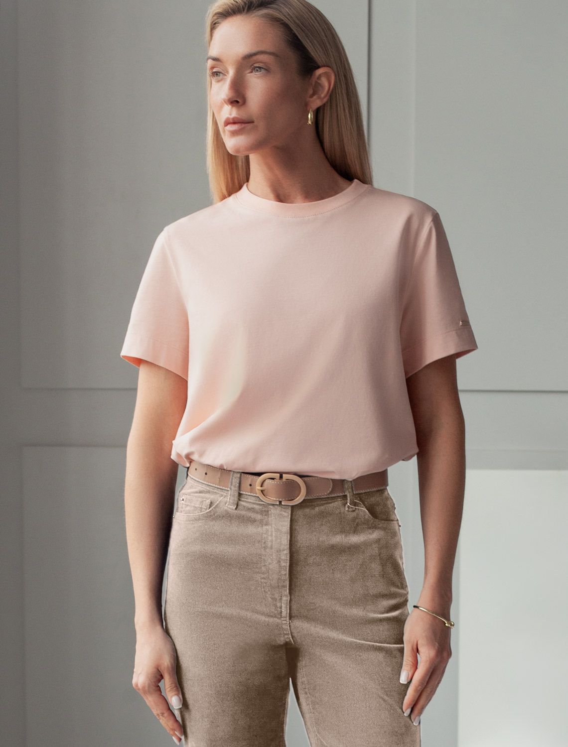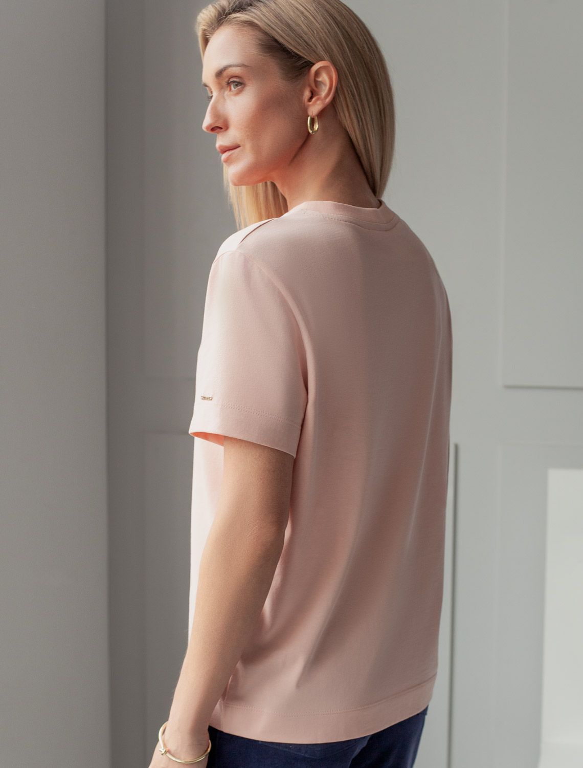 Базовая однотонная футболка из премиального хлопка. Горловина выполнена из рибаны в тон изделия, Добавление эластана в состав изделия способствует формоустойчивости. Самое высокое качество хлопковых волокон обеспечивает комфорт в любое время года. Идеально держит форму и сохраняет внешний вид в течение долговременного использования. Универсальная базовая вещь для ваших стилистических решений. Изделие дополнено металлическим логотипом бренда на рукаве.