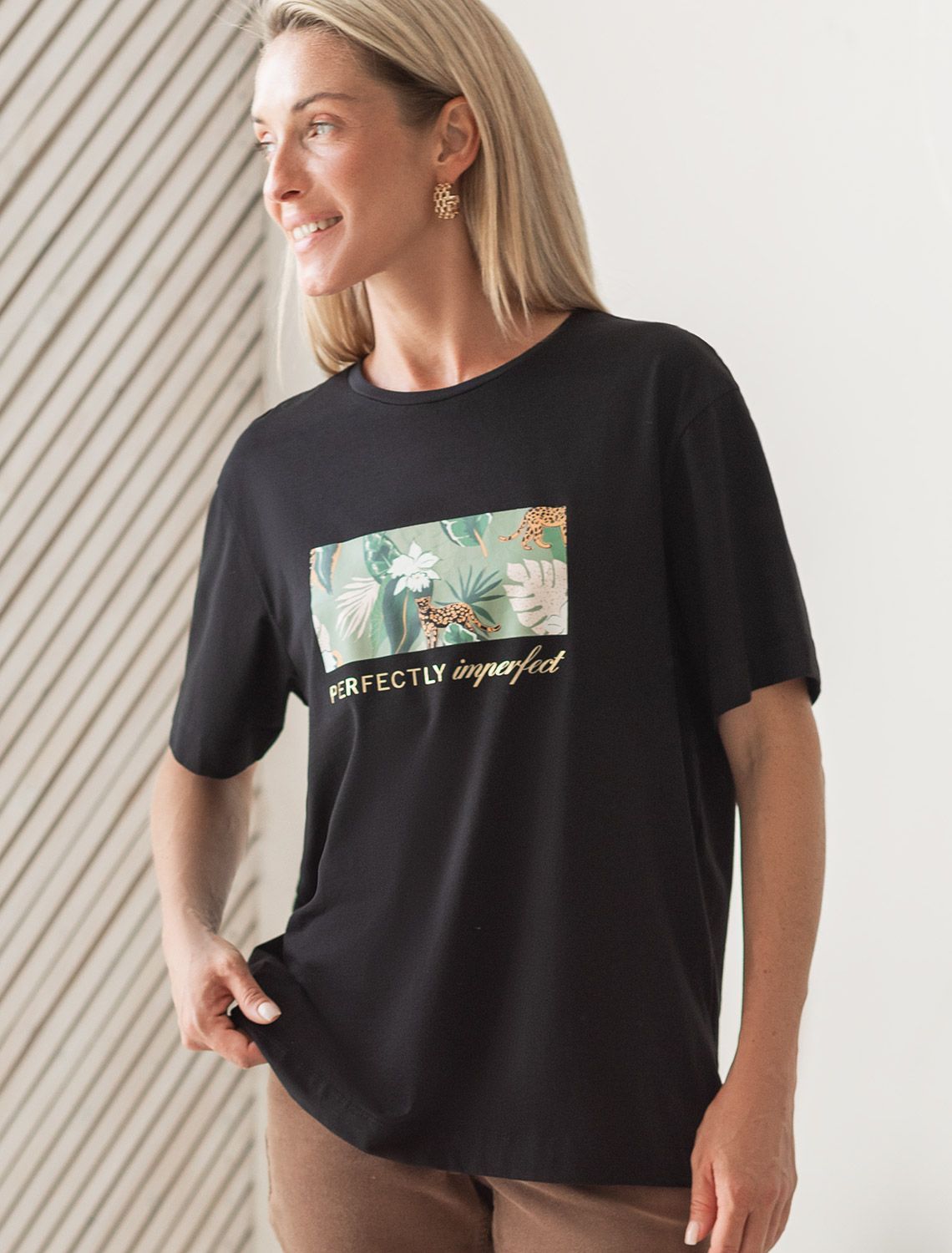 Перевод принта: "Perfectly imperfect - идеально несовершенная". Футболка прямого кроя выполнена из 100% хлопка. Базовая модель с лаконичным авторским принтом легко впишется в повседневный гардероб. Хорошо держит форму и обеспечивает комфортный микроклимат в течение дня.