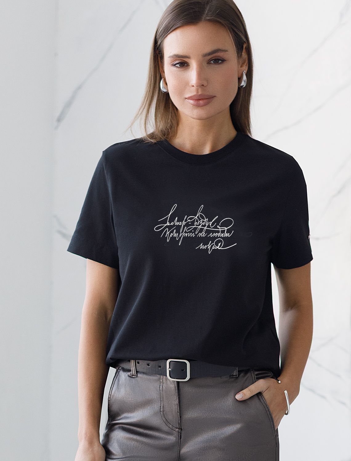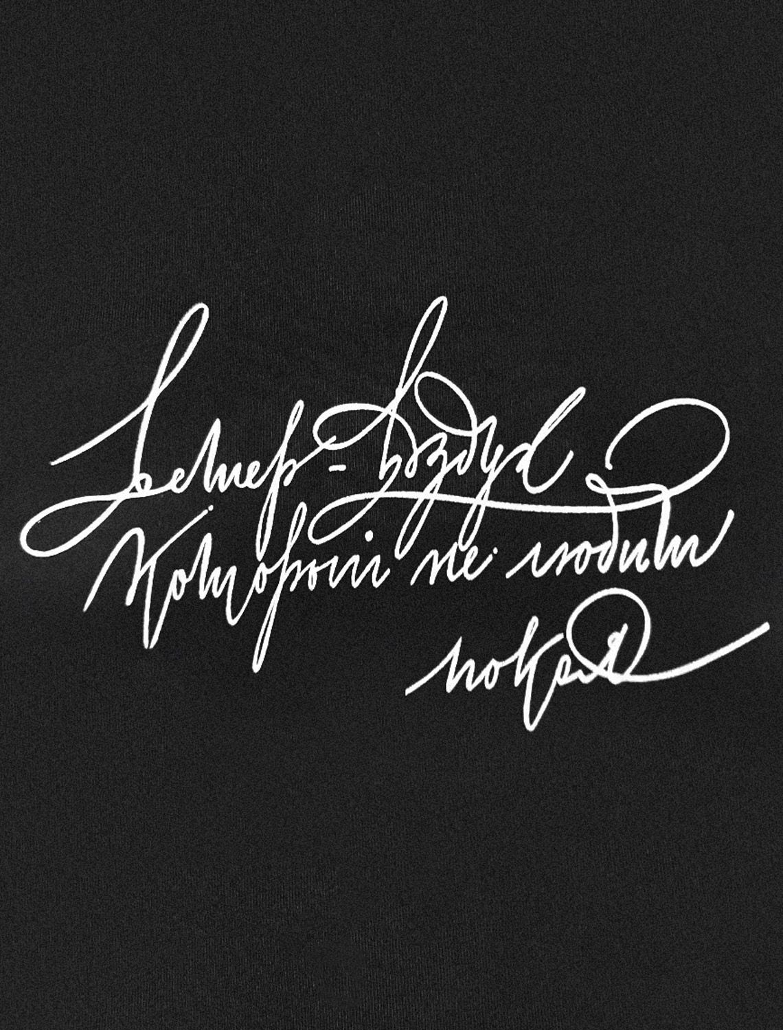 Футболка выполнена из премиального хлопка. Авторский принт нанесен фактурными красками с устойчивым покрытием. Наличие эластана в составе гарантирует комфорт и формоустойчивость. Изделие дополнено фирменным металлическим логотипом бренда.