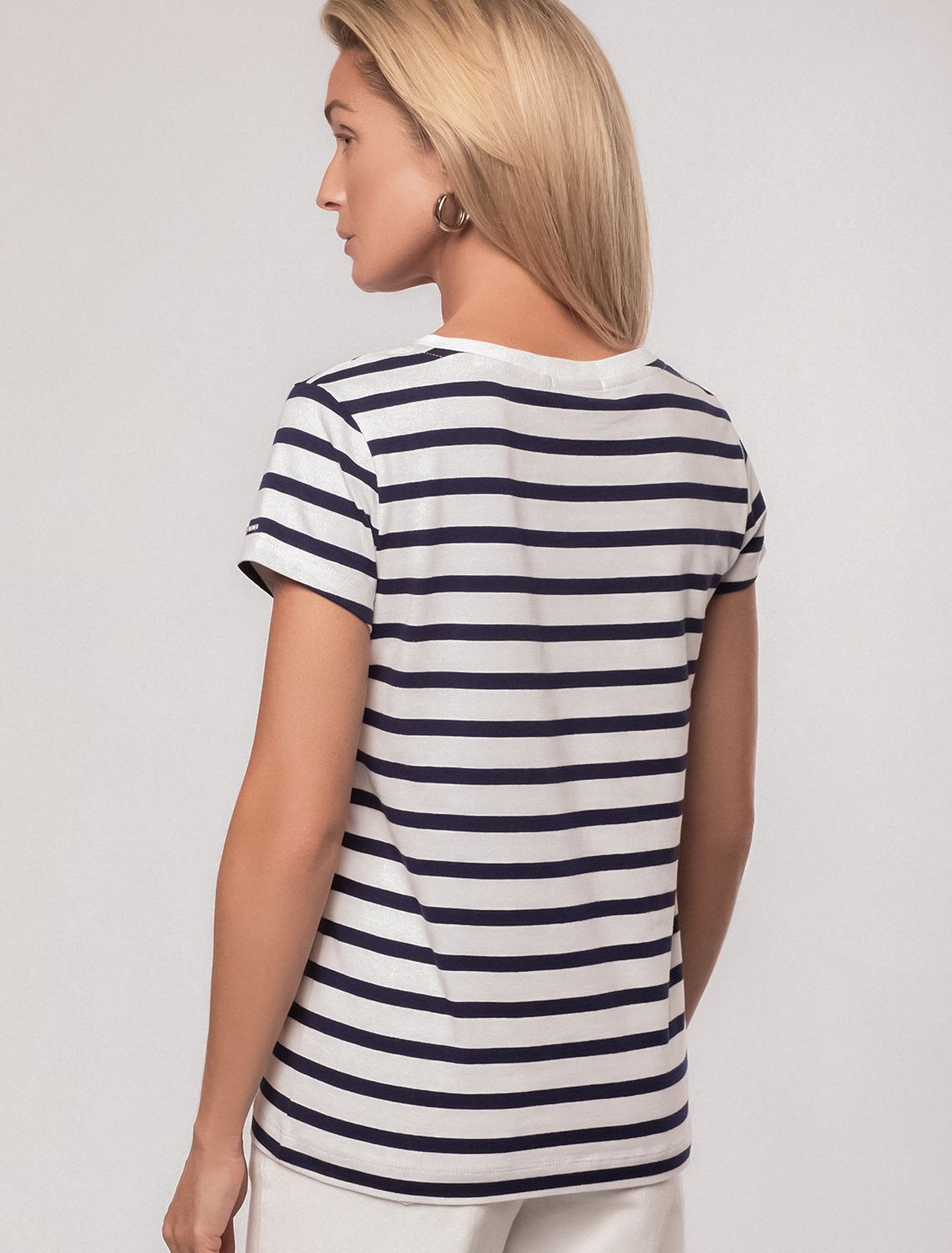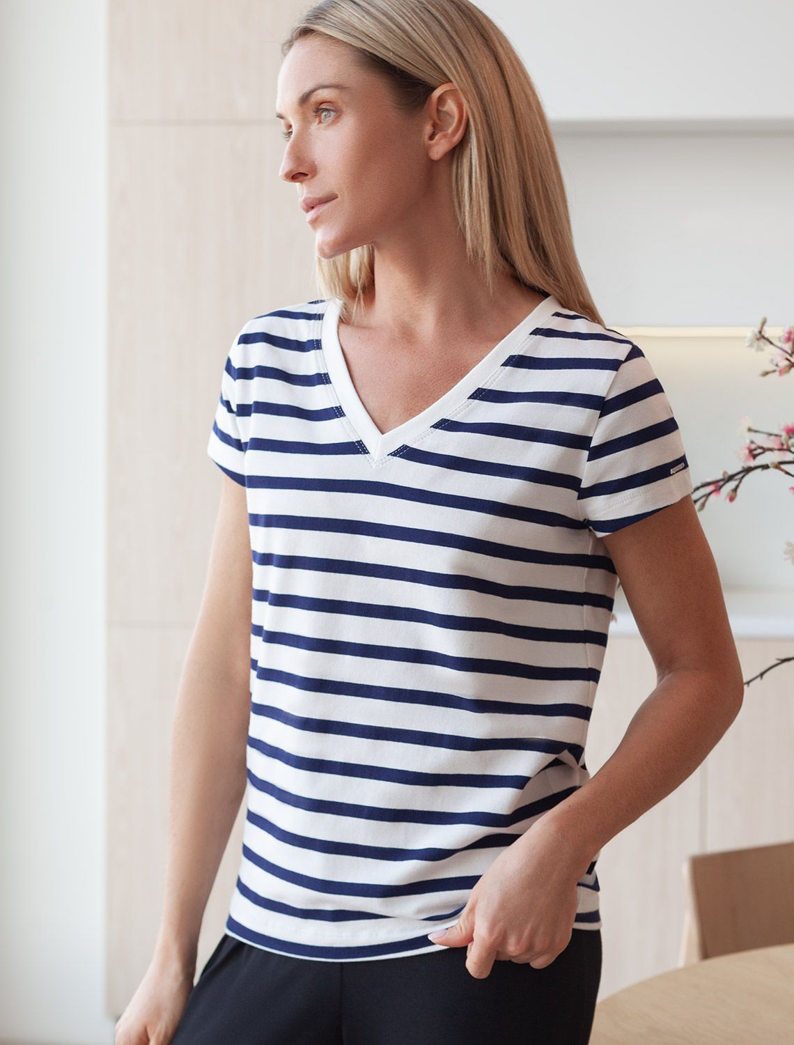 Футболка с V-образным вырезом выполнена из премиального хлопка. Добавление эластана в состав изделия способствует формоустойчивости. Самое высокое качество длинноволокнистых хлопковых волокон обеспечивает комфорт в любое время года. Изделие дополнено металлическим логотипом бренда.