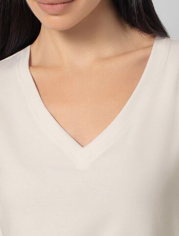 Однотонная футболка с V-образным вырезом выполнена из премиального хлопка. Добавление эластана в состав изделия способствует формоустойчивости. Самое высокое качество длинноволокнистых хлопковых волокон обеспечивает комфорт в любое время года. Совет стилиста: очищенная от декора базовая модель будет уместна не только в повседневном образе с денимом, но и в офисе с нестрогим дресс-кодом, в паре с брюками и жакетом.