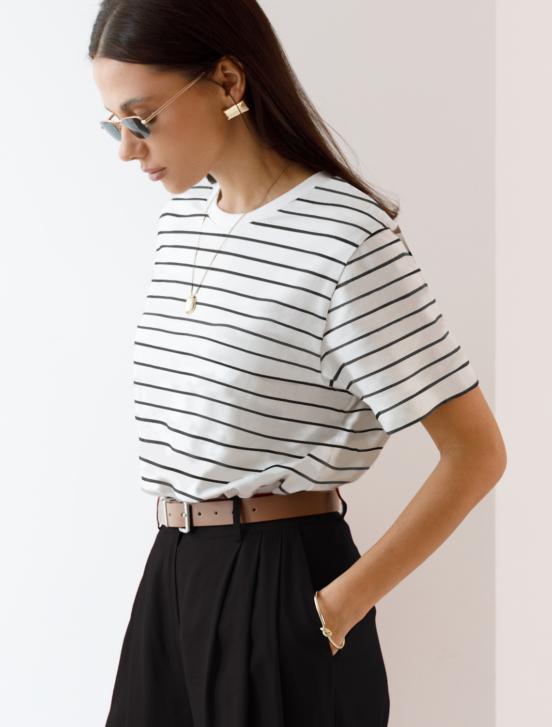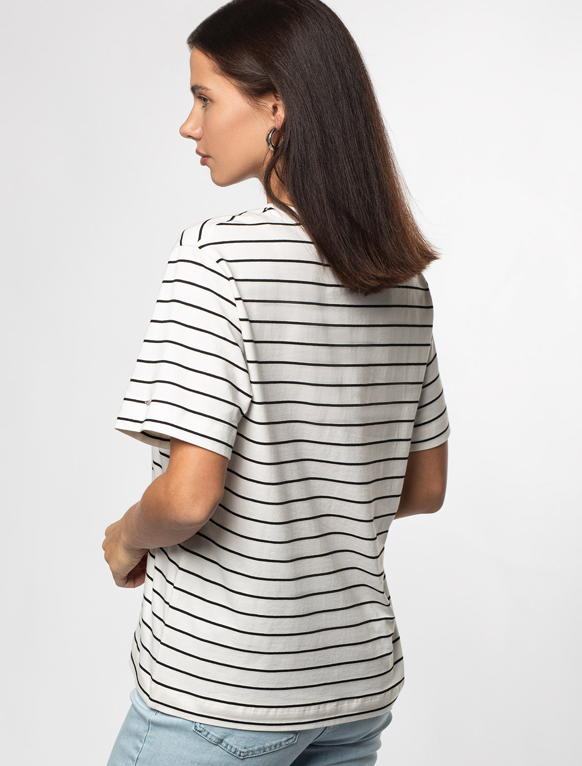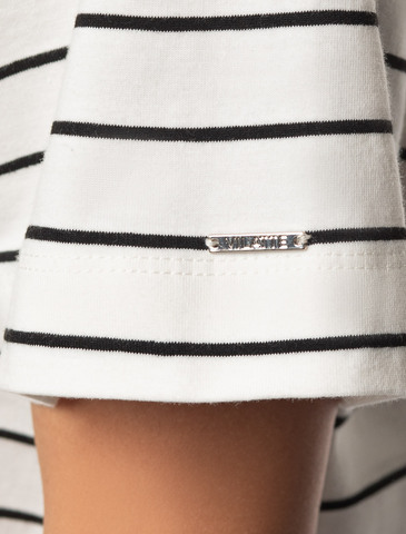 Футболка выполнена из премиального хлопка. Наличие эластана гарантирует абсолютный комфорт и долговечность изделия. Модель в полоску предлагаем сочетать с однотонными вещами базовой палитры. Изделие дополнено металлическим логотипом бренда.