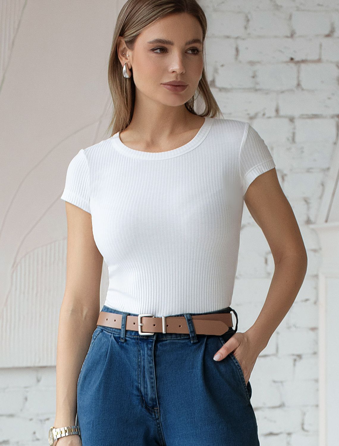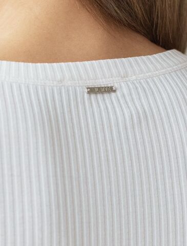 Футболка выполнена из трикотажа в широкий рубчик. Эластичный хлопковый трикотаж сидит по фигуре, не сковывает движений и очень комфортный в носке. Фактура вертикальных полос визуально стройнит и вытягивает силуэт. Базовое изделие хорошо впишется в любой гардероб. Идеально подходит для многослойных образов.