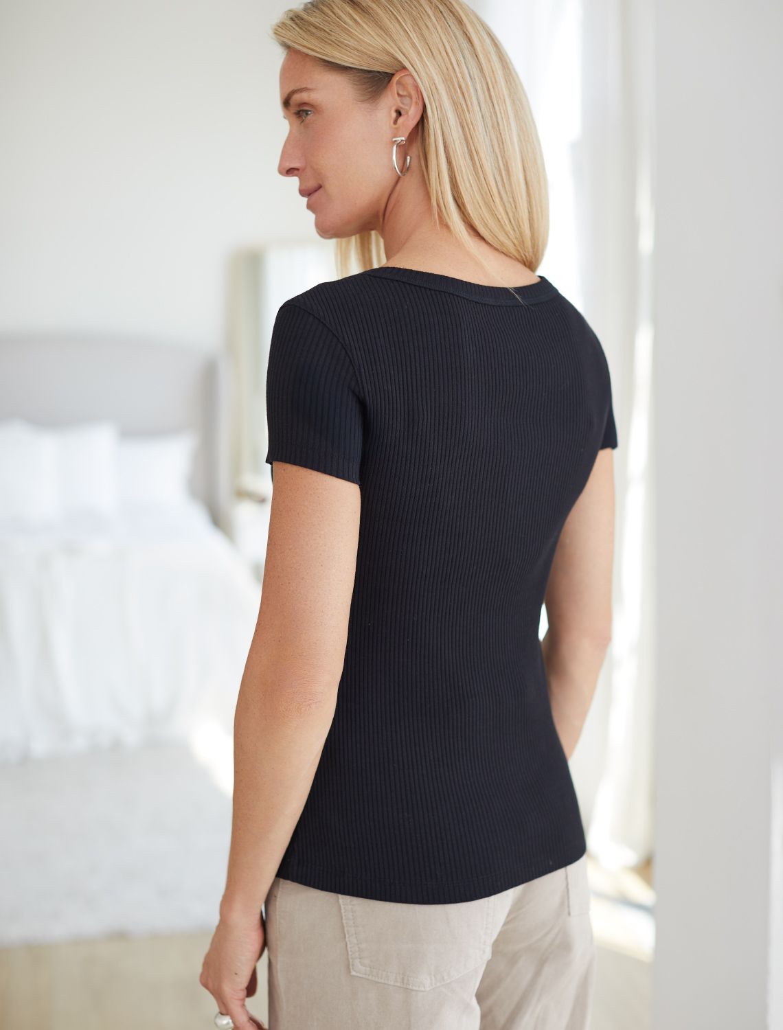 Футболка выполнена из трикотажа в широкий рубчик. Модель с квадратным вырезом дополнена декоративными пуговицами. Эластичный хлопковый трикотаж сидит по фигуре, не сковывает движений и очень комфортный в носке. Фактура вертикальных полос визуально стройнит и вытягивает силуэт. Базовое изделие хорошо впишется в любой гардероб. Идеально подходит для многослойных образов.