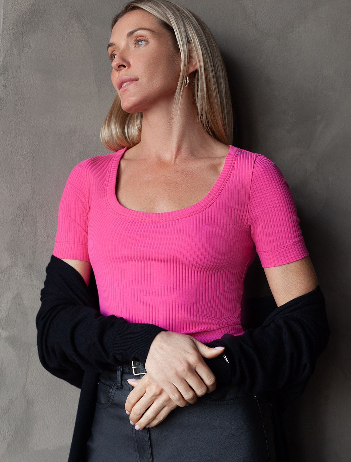 Футболка выполнена из трикотажа в широкий рубчик. Модель с круглым вырезом. Эластичный хлопковый трикотаж сидит по фигуре, не сковывает движений и очень комфортный в носке. Фактура вертикальных полос визуально стройнит и вытягивает силуэт. Базовое изделие хорошо впишется в любой гардероб. Идеально подходит для многослойных образов.