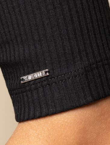Футболка выполнена из трикотажа в широкий рубчик. Базовая модель с круглым вырезом и рукавом до локтя. Эластичный хлопковый трикотаж сидит по фигуре, не сковывает движений и очень комфортный в носке. Фактура вертикальных полос визуально стройнит и вытягивает силуэт. Базовое изделие хорошо впишется в любой гардероб. Идеально подходит для многослойных образов в базовый гардероб.