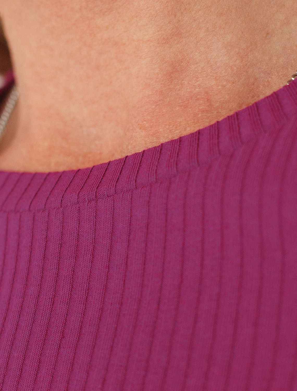 Футболка выполнена из трикотажа в широкий рубчик. Базовая модель с круглым вырезом и рукавом до локтя. Эластичный хлопковый трикотаж сидит по фигуре, не сковывает движений и очень комфортный в носке. Фактура вертикальных полос визуально стройнит и вытягивает силуэт. Базовое изделие хорошо впишется в любой гардероб. Идеально подходит для многослойных образов в базовый гардероб.