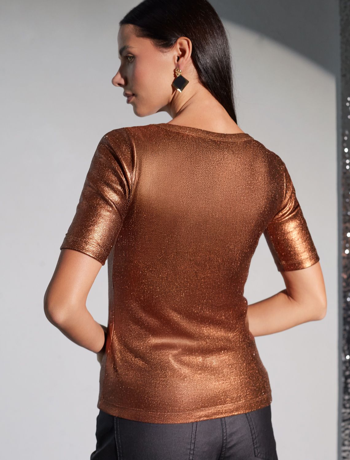 Повседневная футболка универсальна: она сочетается с джинсами, юбками или строгими брюками — легко создать как деловой образ для офиса, так и наряд для вечеринки или ужина вне дома. Матовое покрытие создает благородный блеск без лишней яркости, благодаря чему футболка смотрится свежо и актуально.