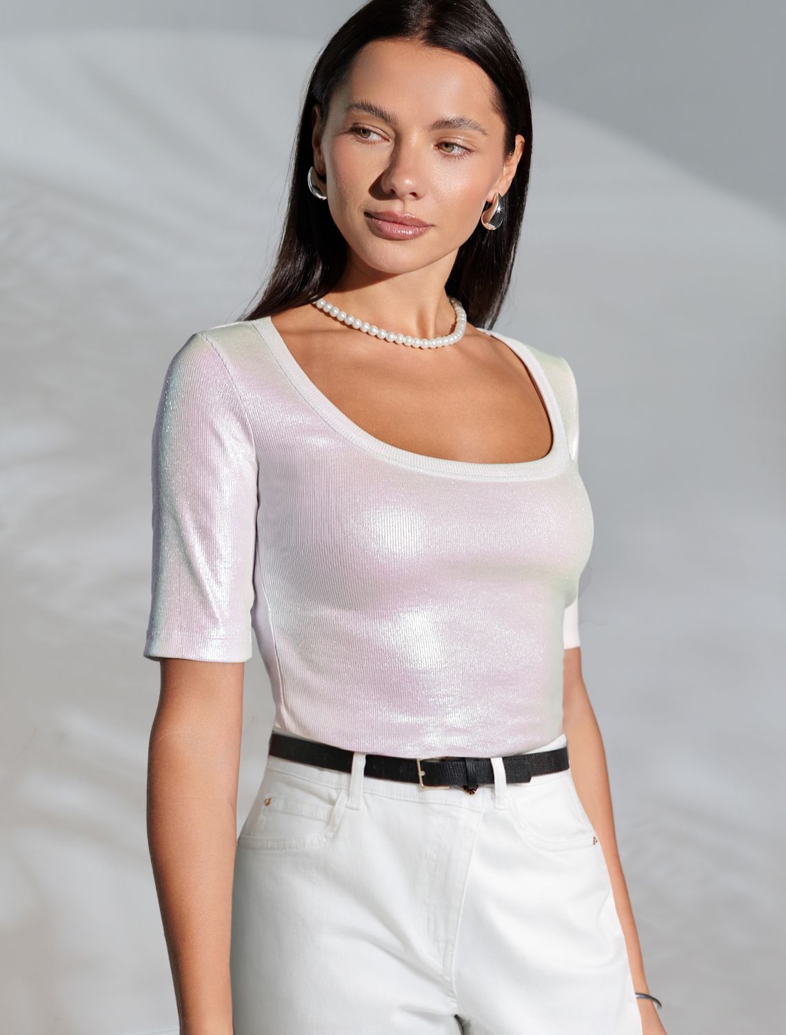Футболка облегающая из хлопка в рубчик с U вырезом и матовым покрытием металлик D49.120 (129368)