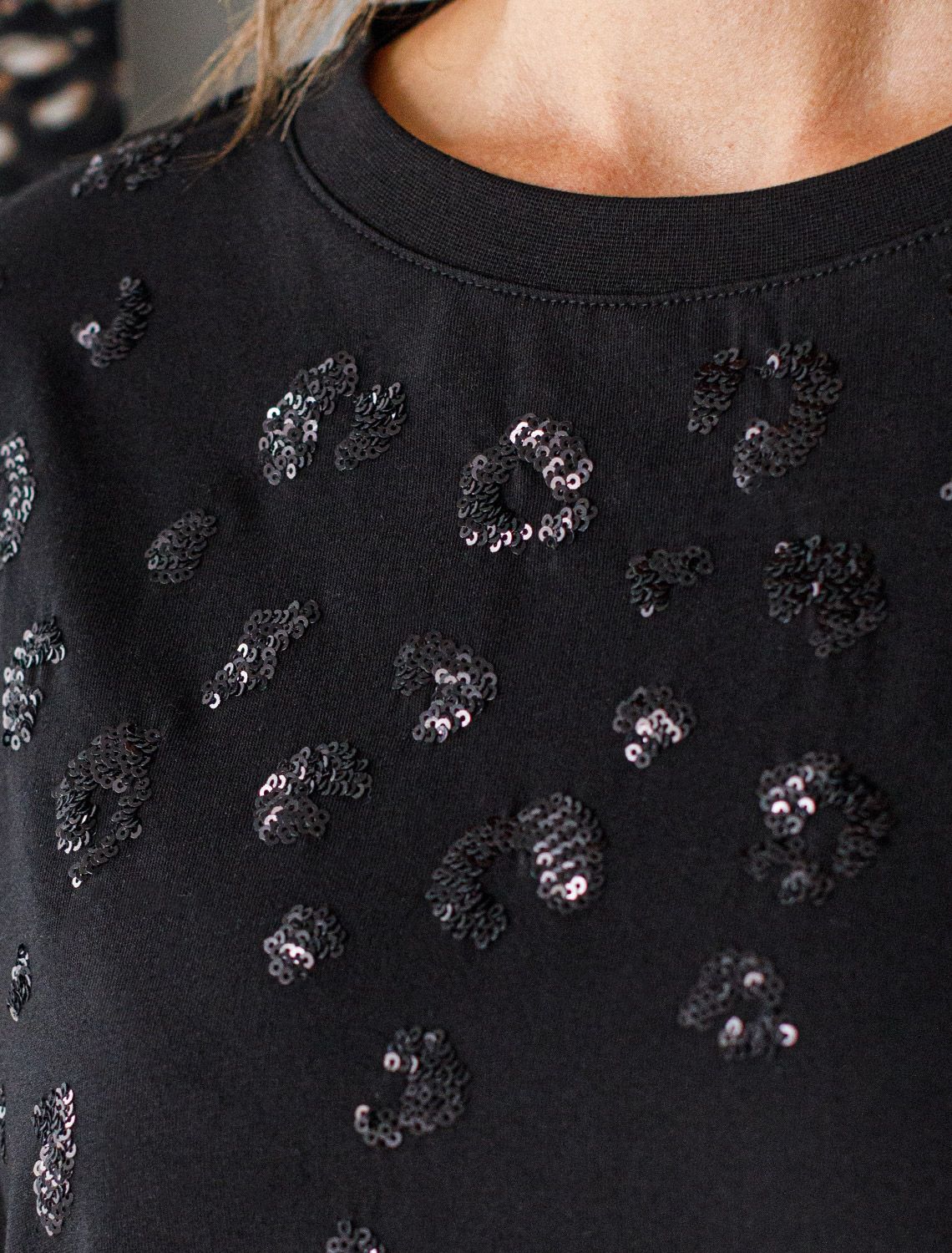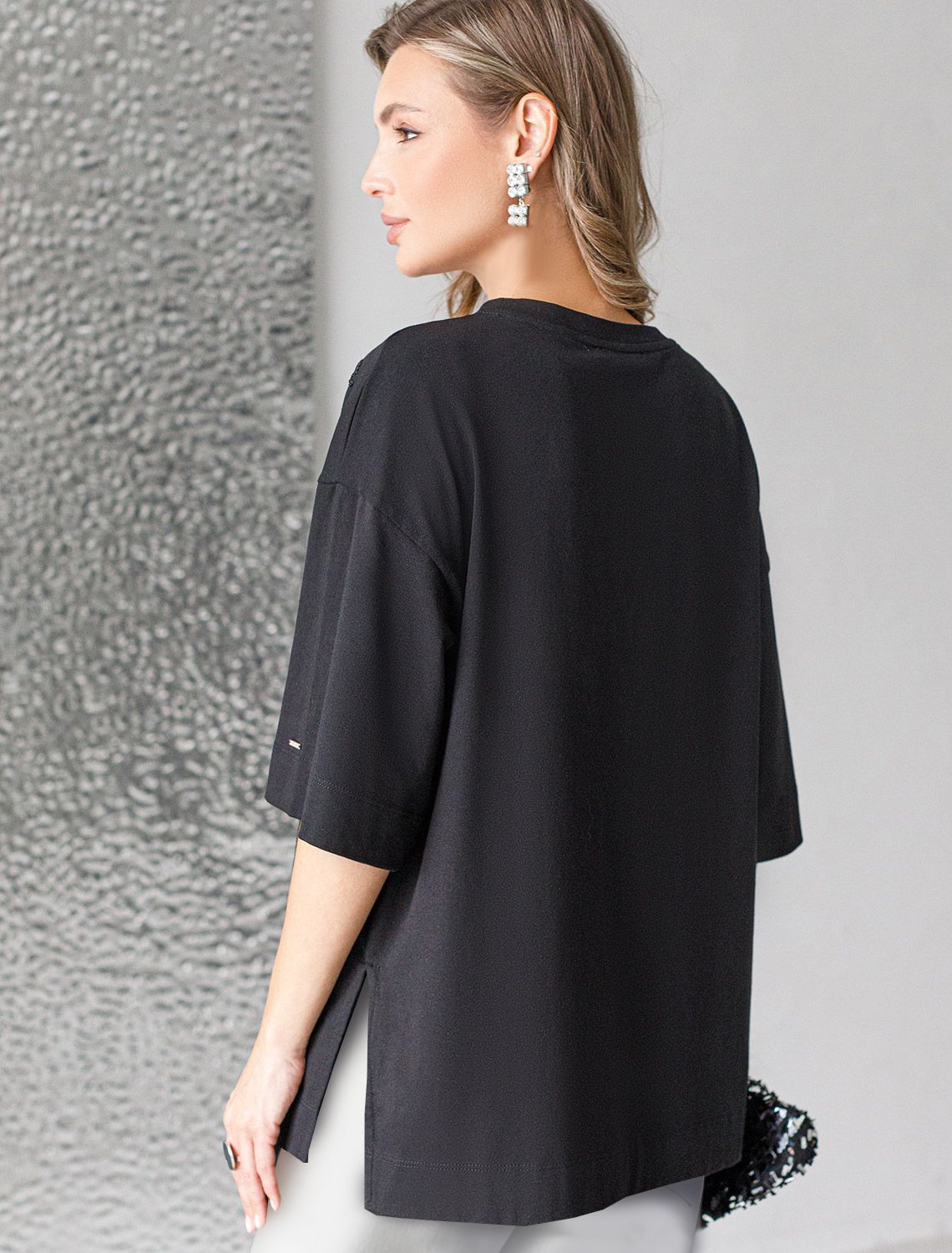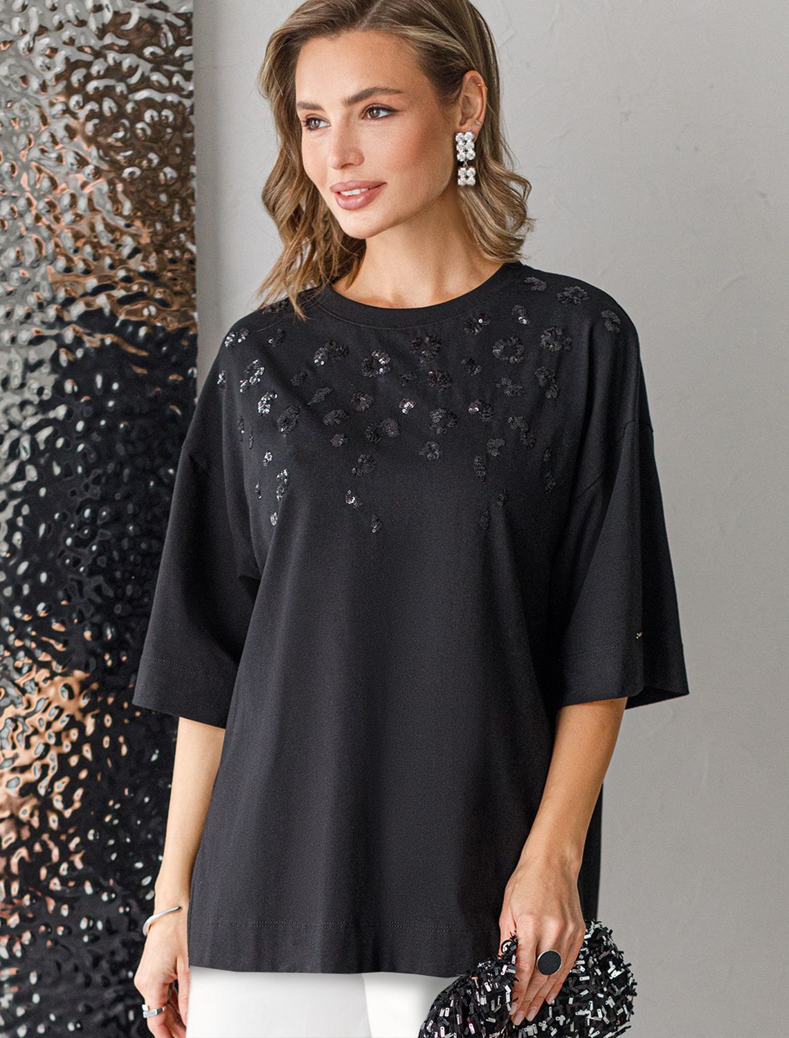 Оверсайз футболка черного цвета из премиального хлопка с добавлением эластана создана для комфорта и стиля каждый день. Натуральный материал приятный к телу, дышащая ткань хорошо держит форму и подходит для повседневной носки дома, в офисе или на прогулке. Классический свободный крой, удлиненный прямой силуэт и свободная посадка делают эту базовую футболку универсальным решением для любой фигуры и роста, включая плюс сайз размеры и беременных девушек, отлично скроет животик. Широкие рукава держат форму и подойдут на полные руки. Нарядная футболка украшена авторским принтом пайетками. Такой акцент делает модель уместной как для особых случаев, так и для ежедневных образов.