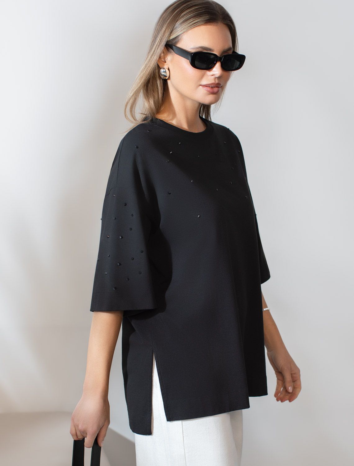Оверсайз футболка черного цвета из премиального хлопка с добавлением эластана создана для комфорта и стиля каждый день. Натуральный материал приятный к телу, дышащая ткань хорошо держит форму и подходит для повседневной носки дома, в офисе или на прогулке. Классический свободный крой, удлиненный прямой силуэт и свободная посадка делают эту базовую футболку универсальным решением для любой фигуры и роста, включая плюс сайз размеры и беременных девушек, отлично скроет животик. Широкие рукава держат форму и подойдут на полные руки. Нарядная футболка украшена авторским принтом в виде россыпи страз в тон основного полотна, которые создают красивый мерцающий эффект. Такой акцент делает модель уместной как для особых случаев, так и для ежедневных образов.