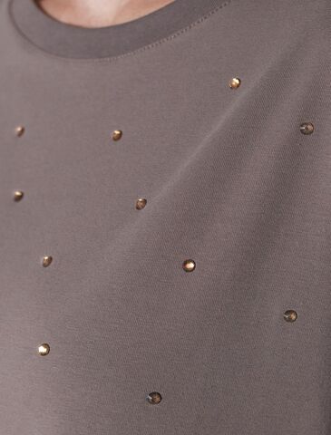 Оверсайз футболка кофейного цвета из премиального хлопка с добавлением эластана создана для комфорта и стиля каждый день. Натуральный материал приятный к телу, дышащая ткань хорошо держит форму и подходит для повседневной носки дома, в офисе или на прогулке. Классический свободный крой, удлиненный прямой силуэт и свободная посадка делают эту базовую футболку универсальным решением для любой фигуры и роста, включая плюс сайз размеры и беременных девушек, отлично скроет животик. Широкие рукава держвт форму и подойдут на полные руки. Нарядная футболка украшена авторским принтом в виде россыпи страз в тон основного полотна, которые создают красивый мерцающий эффект. Такой акцент делает модель уместной как для особых случаев, так и для ежедневных образов.