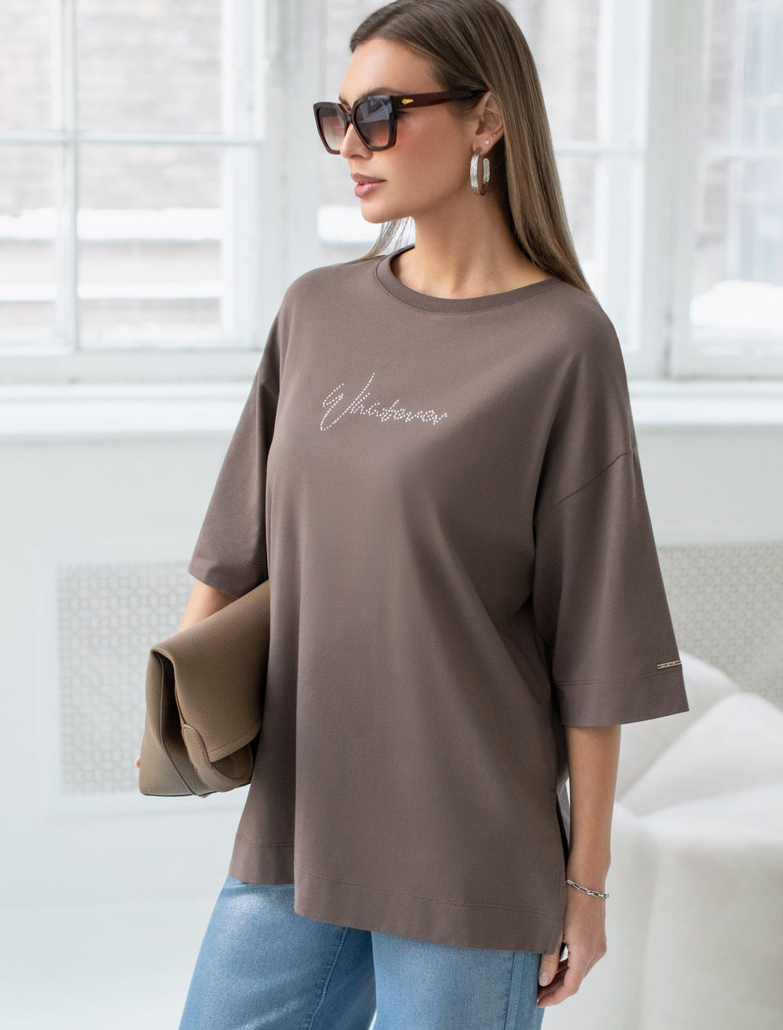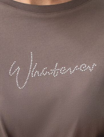 Оверсайз футболка кофейного цвета с из премиального хлопка с добавлением эластана создана для комфорта и стиля каждый день. Натуральный материал приятный к телу, дышащая ткань хорошо держит форму и подходит для повседневной носки дома, в офисе или на прогулке. Классический свободный крой, удлиненный прямой силуэт и свободная посадка делают эту базовую футболку универсальным решением для любой фигуры и роста, включая плюс сайз размеры и беременных девушек, отлично скроет животик. Широкие рукава держат форму и подойдут на полные руки. Нарядная футболка украшена авторским принтом в виде надписи блестящими стразами, которые создают красивый мерцающий эффект. Перевод надписи Whatever - Что бы ни... Такой акцент делает модель уместной как для особых случаев, так и для ежедневных образов.
