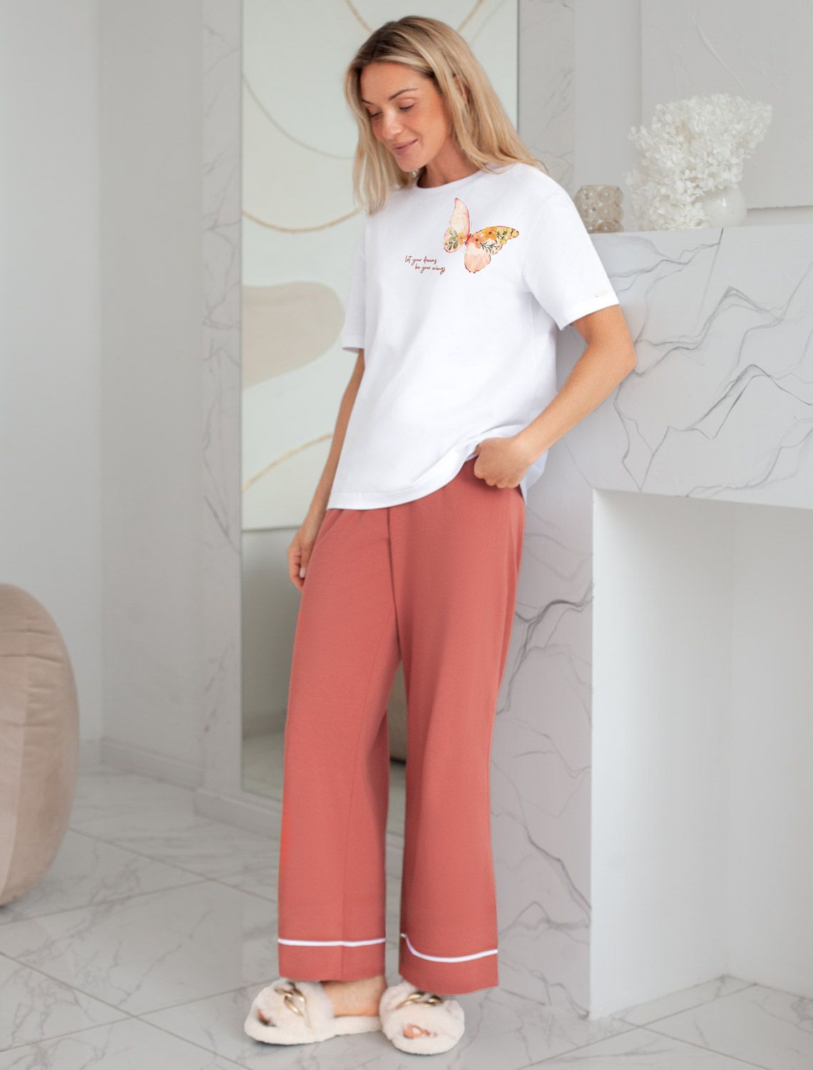 Особое внимание привлекает стильный принт в виде бабочки с минималистичной надписью. Перевод надписи Let your dreams be your wings - Пусть твои мечты станут твоими крыльями. Принт выполнен красками с устойчивым покрытием, который добавляет изделию оригинальности и позволяет выразить индивидуальность.