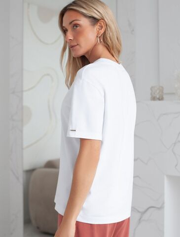 Футболка белого цвета изготовлена из премиального хлопка с эластаном, она обеспечивает невероятное ощущение уюта и легкости. Натуральный материал сохраняет форму и цвет после множества стирок, обеспечивая долговечность изделия, а его высокая воздухопроницаемость создает ощущение свежести даже в течение долгого дня.
