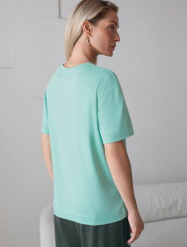 Футболка мятного цвета изготовлена из премиального хлопка с эластаном, она обеспечивает невероятное ощущение уюта и легкости. Натуральный материал сохраняет форму и цвет после множества стирок, обеспечивая долговечность изделия, а его высокая воздухопроницаемость создает ощущение свежести даже в течение долгого дня.