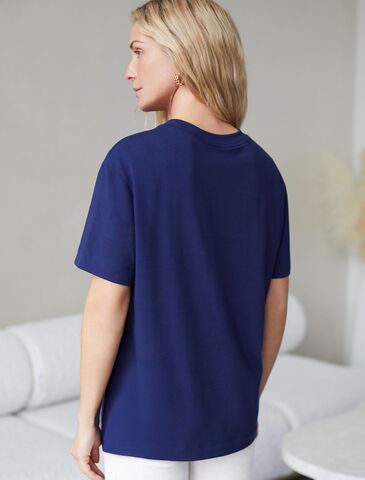 Футболка темно-синего цвета изготовлена из премиального хлопка с эластаном, она обеспечивает невероятное ощущение уюта и легкости. Натуральный материал сохраняет форму и цвет после множества стирок, обеспечивая долговечность изделия, а его высокая воздухопроницаемость создает ощущение свежести даже в течение долгого дня.