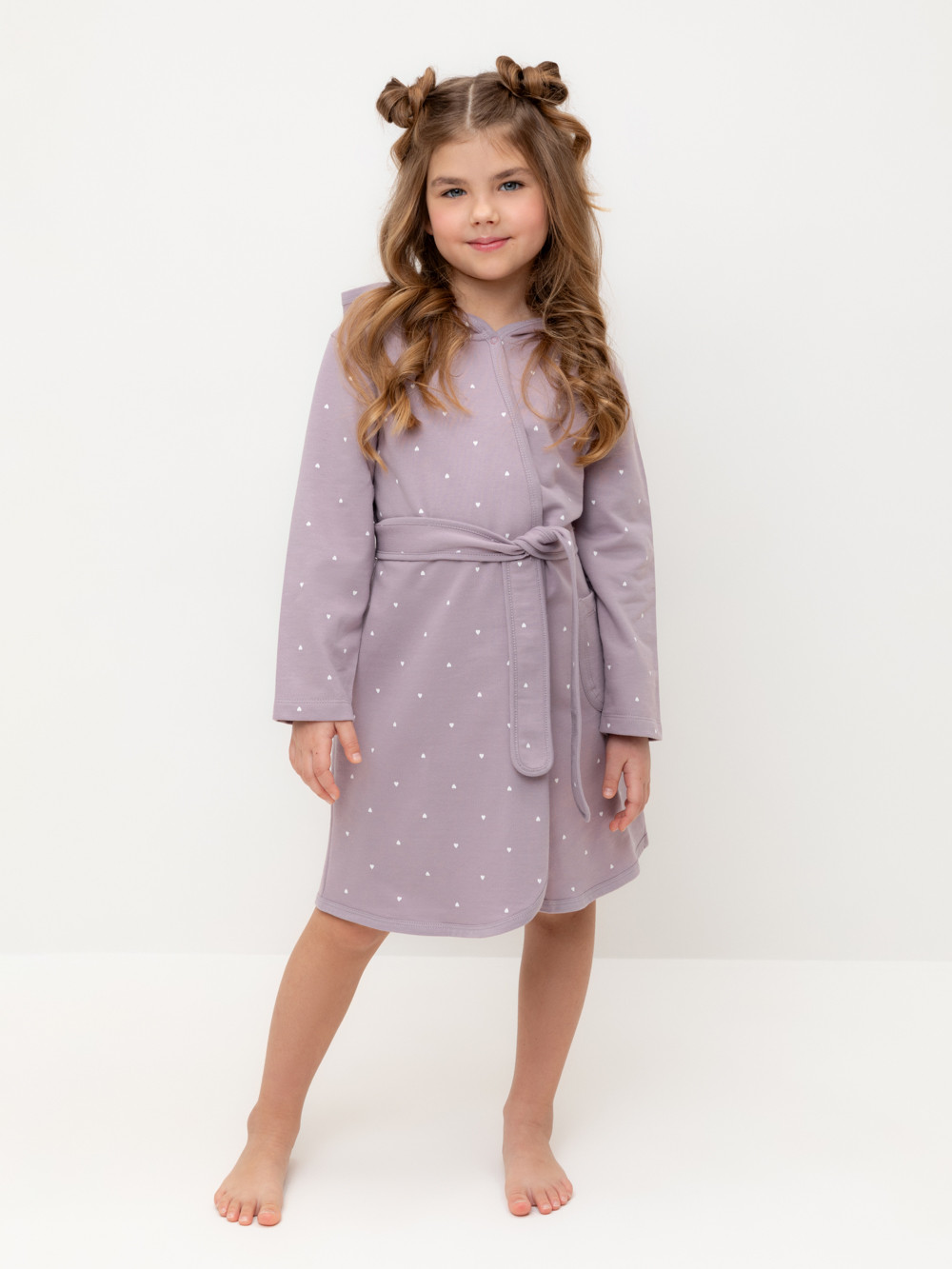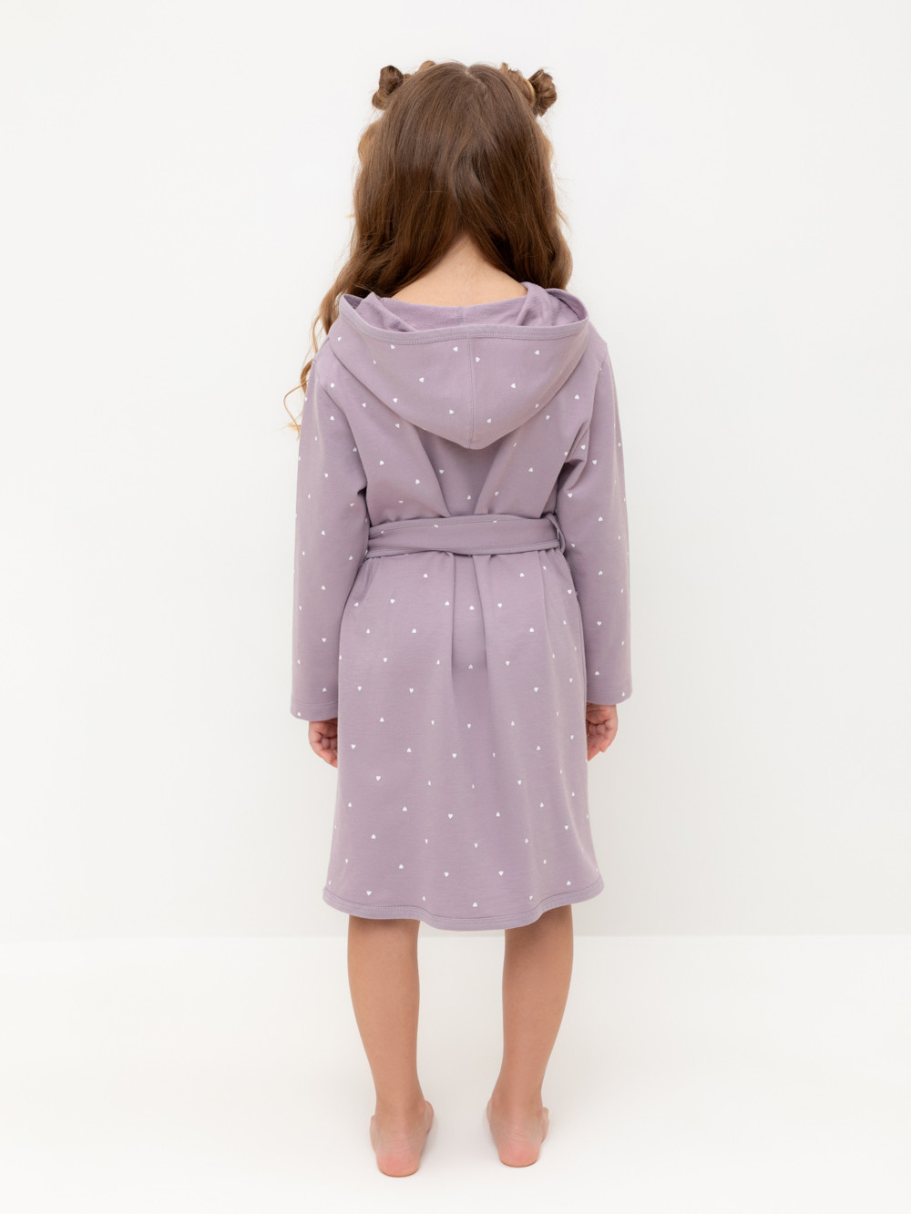 Халат с тонким капюшоном. Изготовлен из набивного хлопкового трикотажа футер петля. С помощью пояса можно регулировать посадку по фигуре. Сверху застёжка на кнопку. Края изделия обработаны мягким кантом. На боку накладной карман, уходящий в шов. Оригинальная набивка выполнена из стойких гипоаллергенных текстильных красителей. Все трикотажные полотна производятся в соответствии с нормами швейцарского сертификата ЭкоТекс.