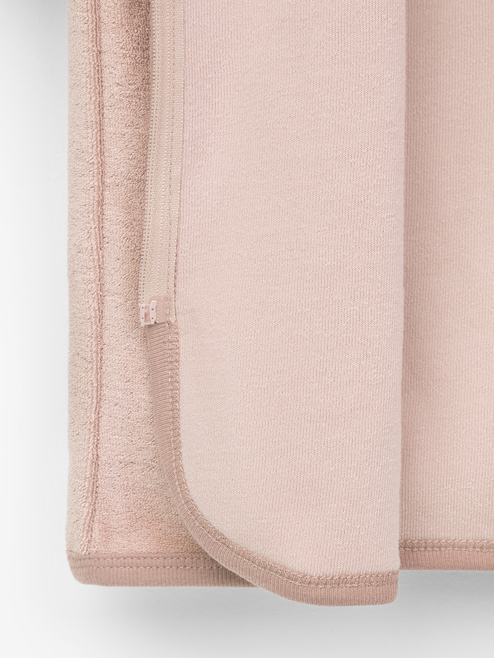 Халат на молнии с капюшоном. Изготовлен из мягкого махрового полотна, произведённого из натурального хлопка. В капюшоне подклад из высококачественного гладкого трикотажа супрем. Края обработаны эластичным кантом. Все трикотажные полотна производятся в соответствии с нормами швейцарского сертификата ЭкоТекс.
