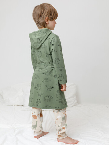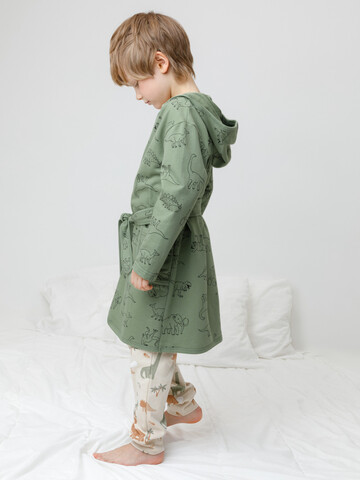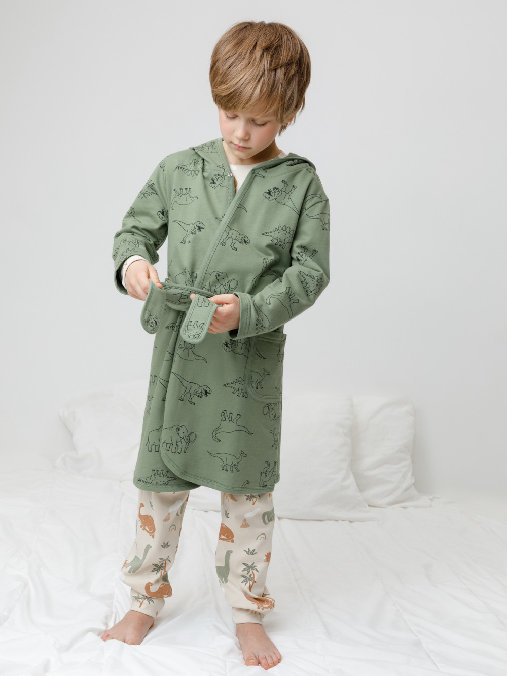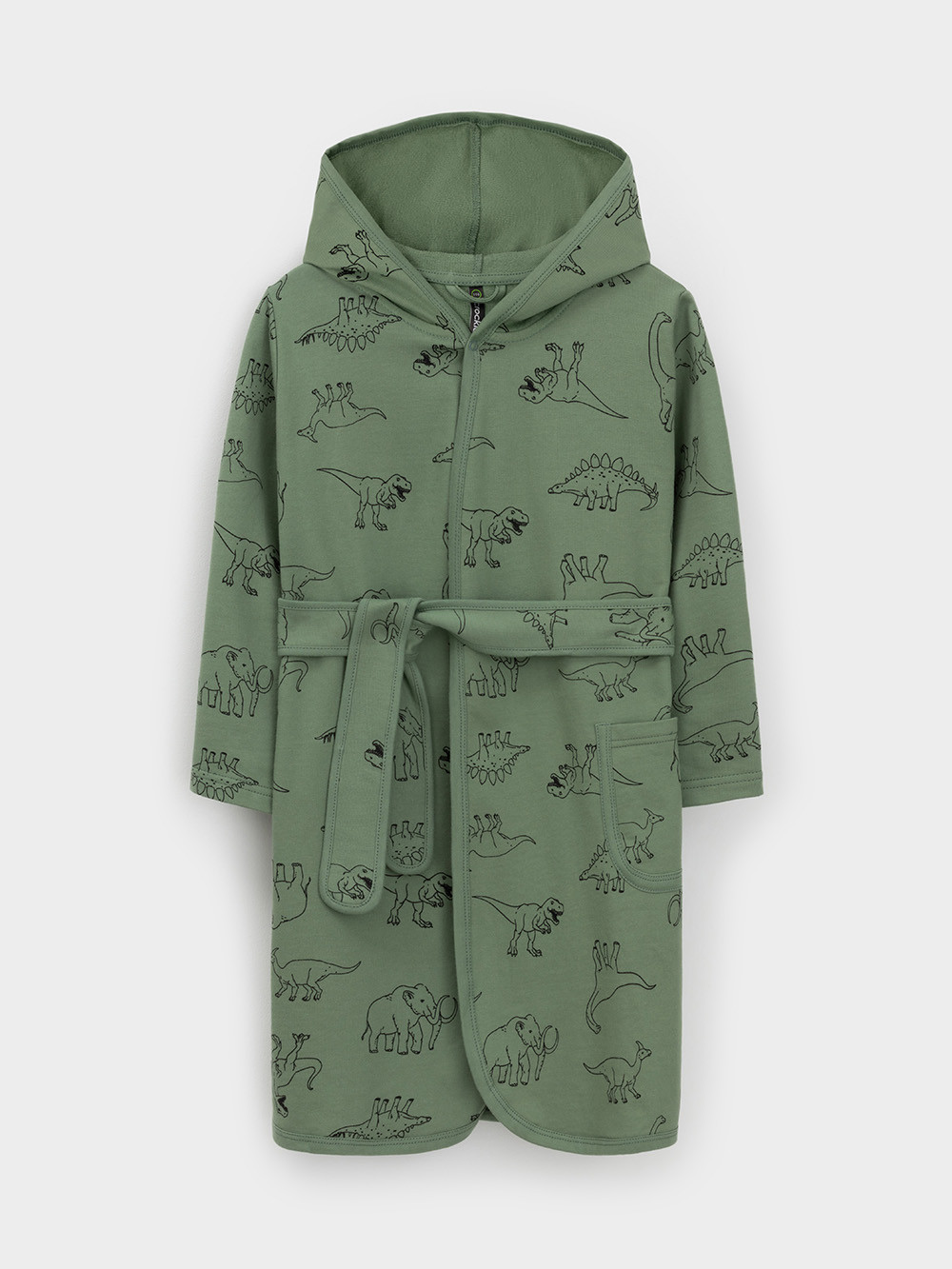Халат с тонким капюшоном. Изготовлен из набивного хлопкового трикотажа футер петля. С помощью пояса можно регулировать посадку по фигуре. Сверху застёжка на кнопку. Края изделия обработаны мягким кантом. На боку накладной карман, уходящий в шов. Оригинальная набивка выполнена из стойких гипоаллергенных текстильных красителей. Все трикотажные полотна производятся в соответствии с нормами швейцарского сертификата ЭкоТекс.