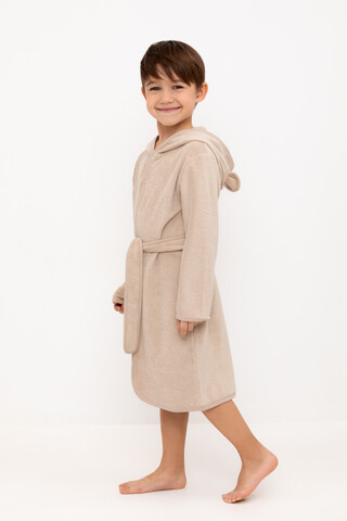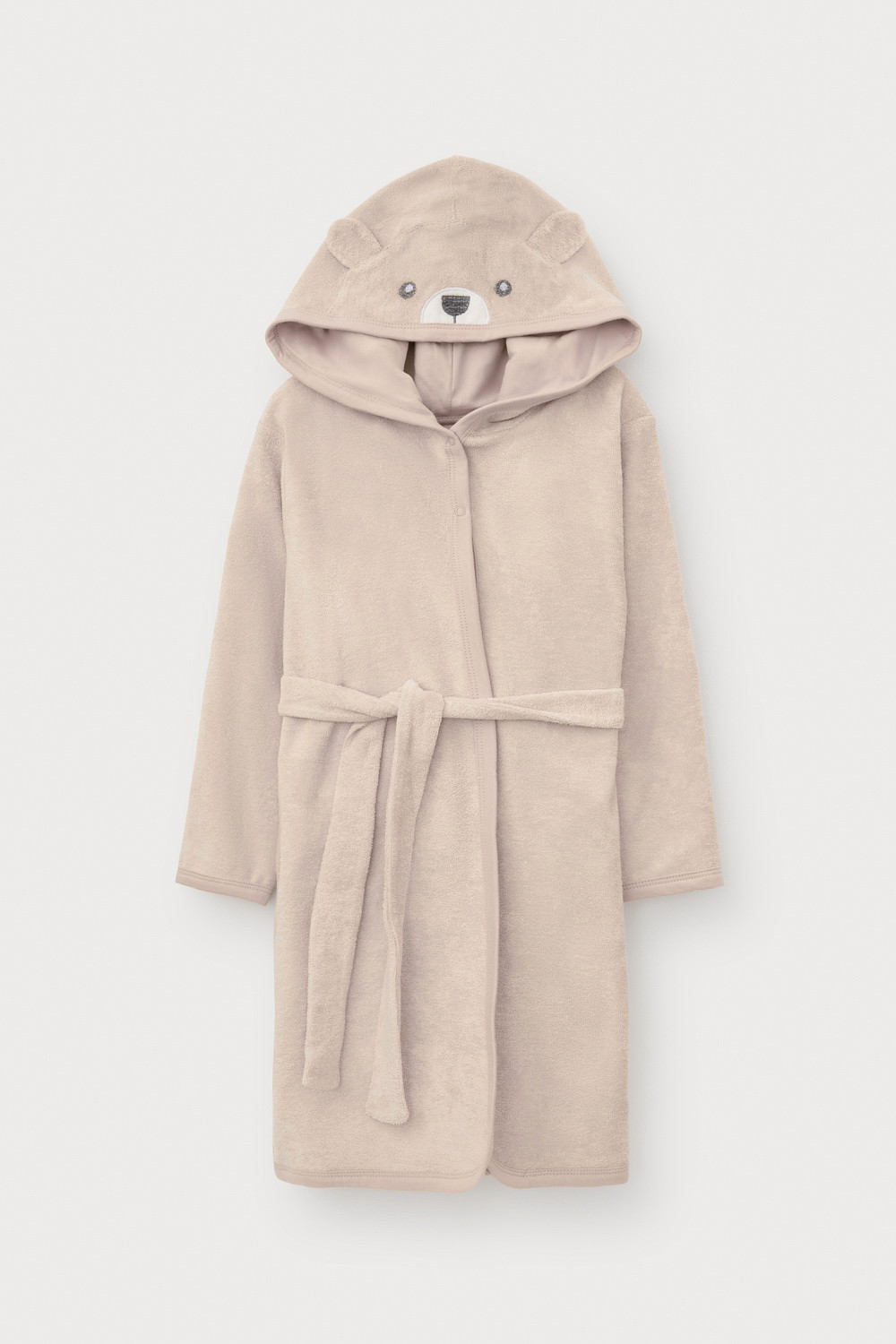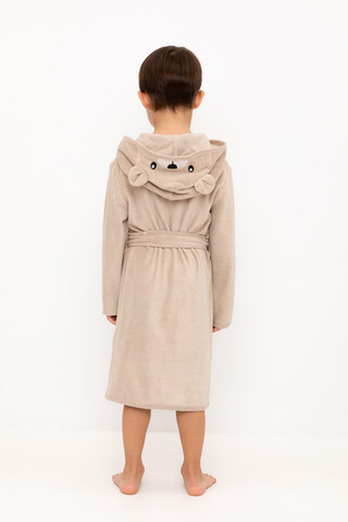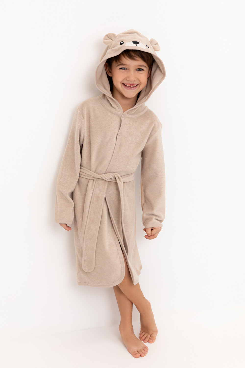 Однотонный махровый халат для мальчика на запахе без начёса. Капюшон с мягким подкладом украшен аппликацией с изображением мишки и объёмными ушками. Пояс продет в петли. На груди дополнительная застёжка на две кнопки. По бокам удобные карманы. Рукава и края изделия обработаны кантом.