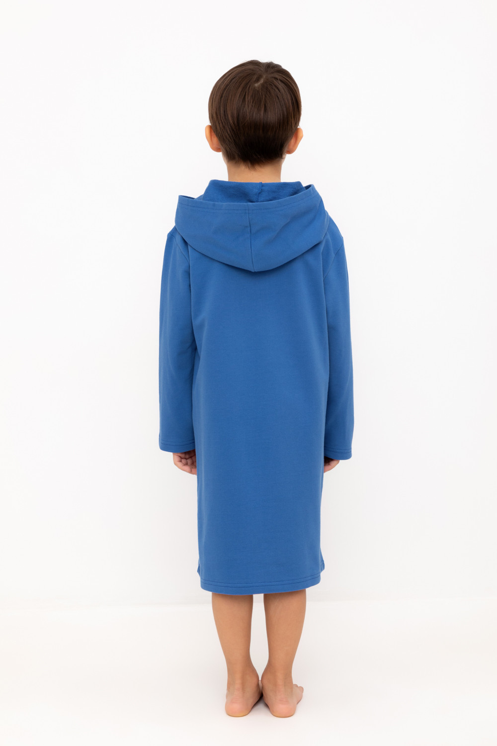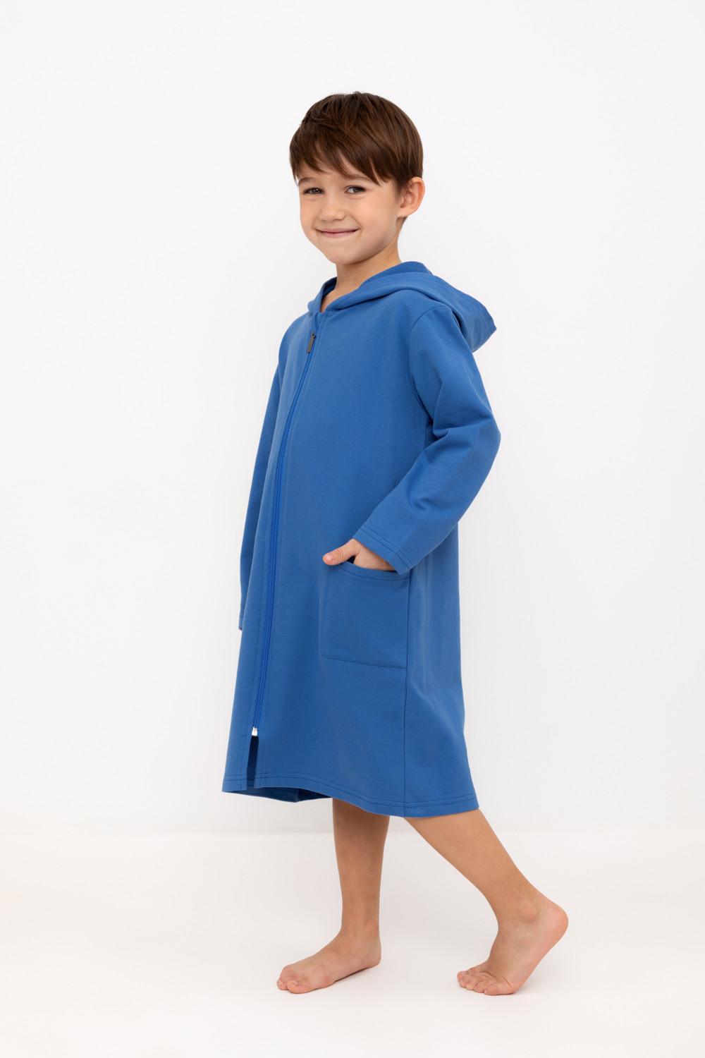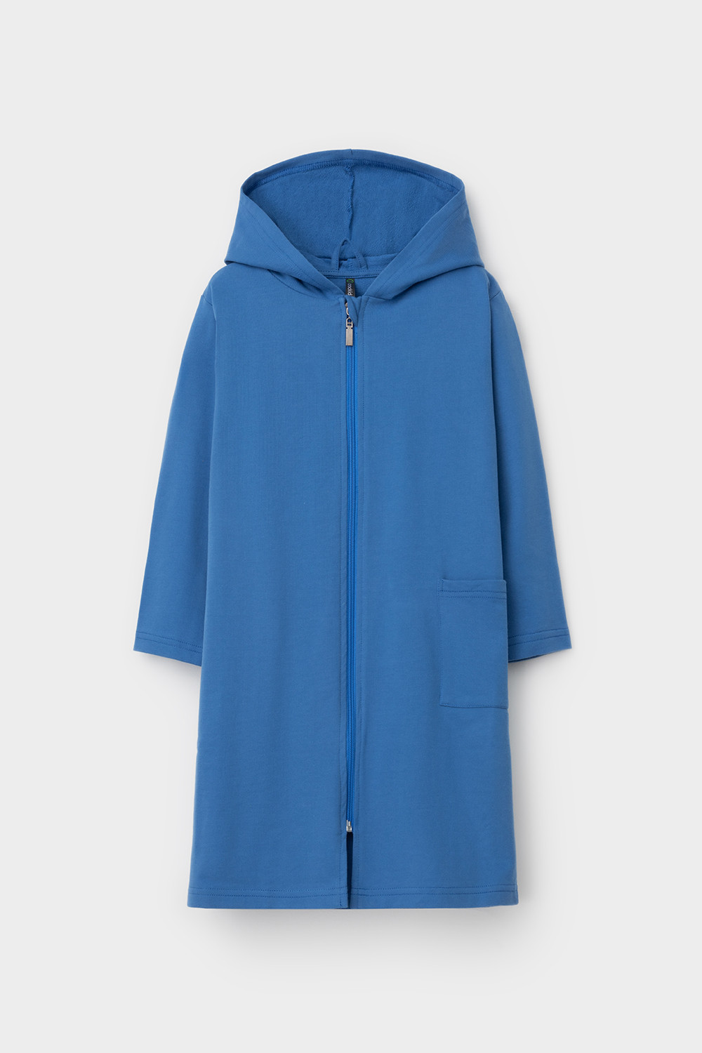 Халат с тонким капюшоном из мягкого набивного трикотажа футер петля. Застёгивается на молнию, предусмотрена мягкая защита подбородка. Накладной карман уходит в шов.