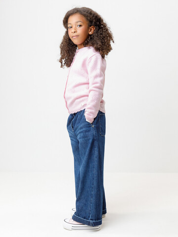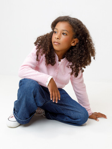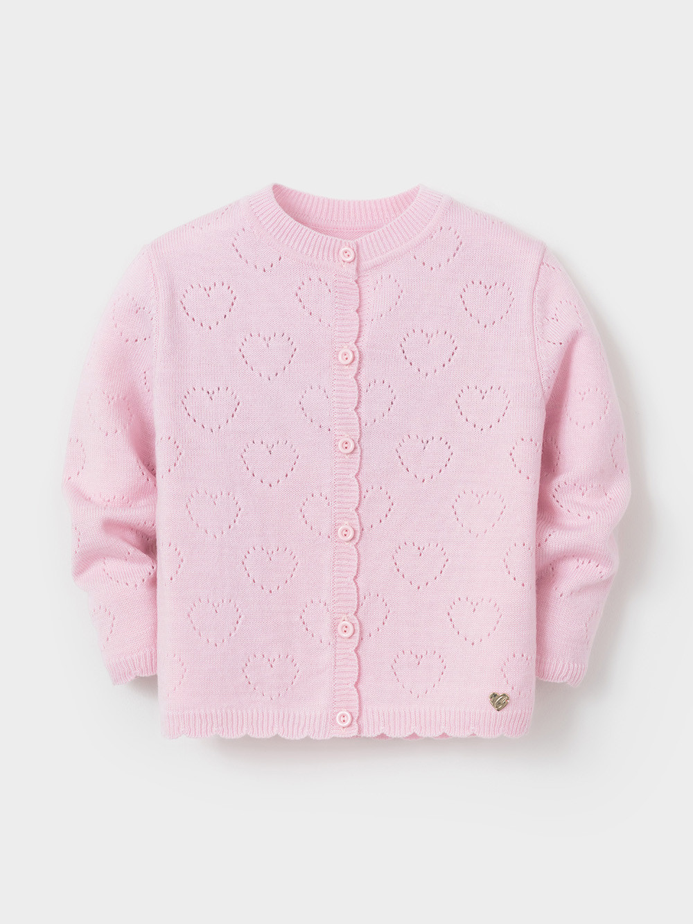 Вязаный кардиган с ажурными сердечками для девочки. Изготовлен из мягкой полушерстяной пряжи. Застёгивается на планку с пуговицами. Длинные рукава, планка и низ изделия с ажурной каймой по краям. Изделие сохраняет форму и стойкий цвет после многочисленных стирок.