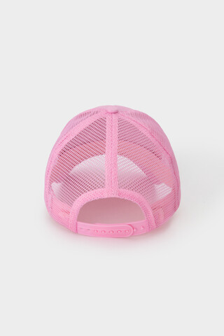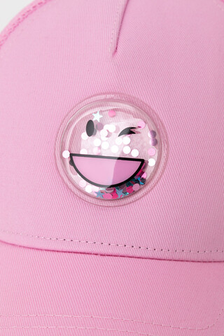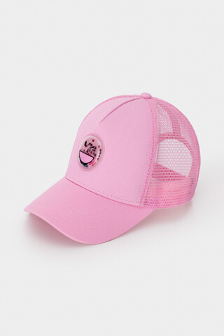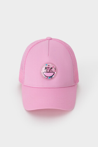 Кепка для девочки из текстиля и сетки. Спереди украшена оригинальной нашивкой с блёстками. Регулируется по ширине головы и фиксируется на затылке с помощью пластиковой застёжки.
