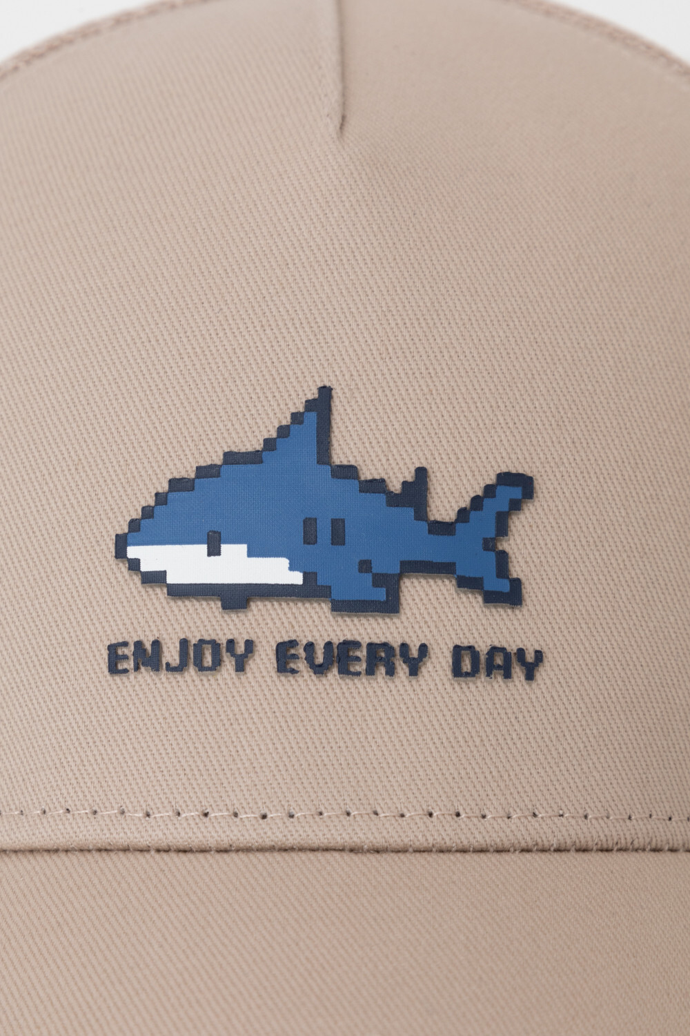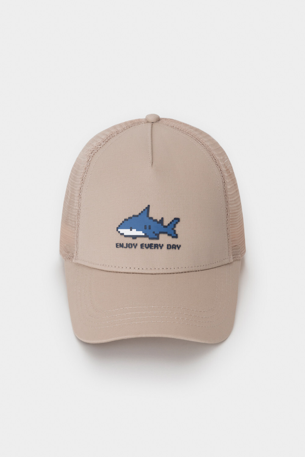 Кепка для мальчика из текстиля и сетки. Спереди украшена оригинальным принтом. Регулируется по ширине головы и фиксируется на затылке с помощью пластиковой застёжки.