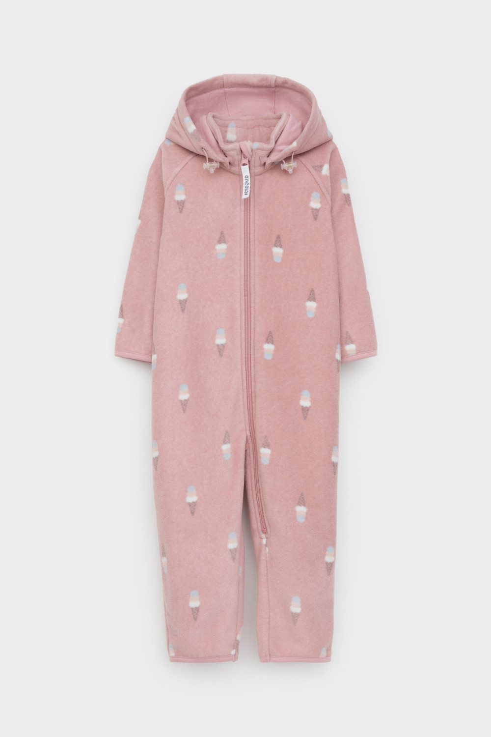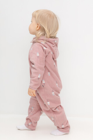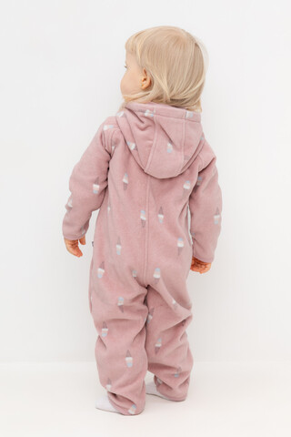 Флисовый комбинезон со съёмным капюшоном для девочки. У изделия высокий воротник и съёмный капюшон на кнопках с подкладом из супрема. Застёгивается на удлинённую молнию. Предусмотрена защита шеи и подбородка. В размерах 40/62 - 48/74 на рукавах и штанинах есть удобные отвороты. Оригинальная набивка выполнена из стойких, гипоаллергенных текстильных красителей. Комбинезон сохраняет цвет и форму после многократных стирок.