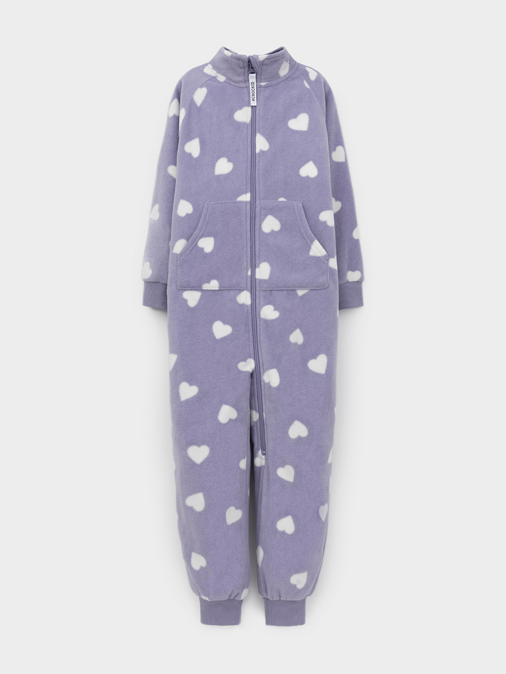 Флисовый комбинезон для девочки с высоким воротником. Застёгивается на удлинённую молнию с мягкой защитой шеи и подбородка. Рукава и низ изделия на манжетах из трикотажа в рубчик. Эластичная резинка по спинке обеспечивает идеальную посадку. Спереди удобный карман-кенгуру. Оригинальная набивка выполнена из стойких гипоаллергенных текстильных красителей. Комбинезон сохраняет цвет и форму после многократных стирок.