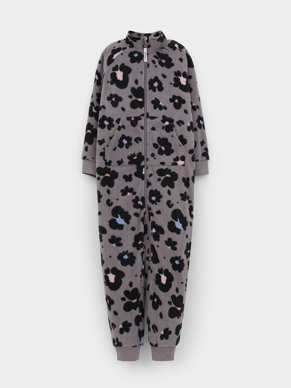 Флисовый комбинезон для девочки с высоким воротником. Застёгивается на удлинённую молнию с мягкой защитой шеи и подбородка. Рукава и низ изделия на манжетах из трикотажа в рубчик. Эластичная резинка по спинке обеспечивает идеальную посадку. Спереди удобный карман-кенгуру. Оригинальная набивка выполнена из стойких гипоаллергенных текстильных красителей. Комбинезон сохраняет цвет и форму после многократных стирок.