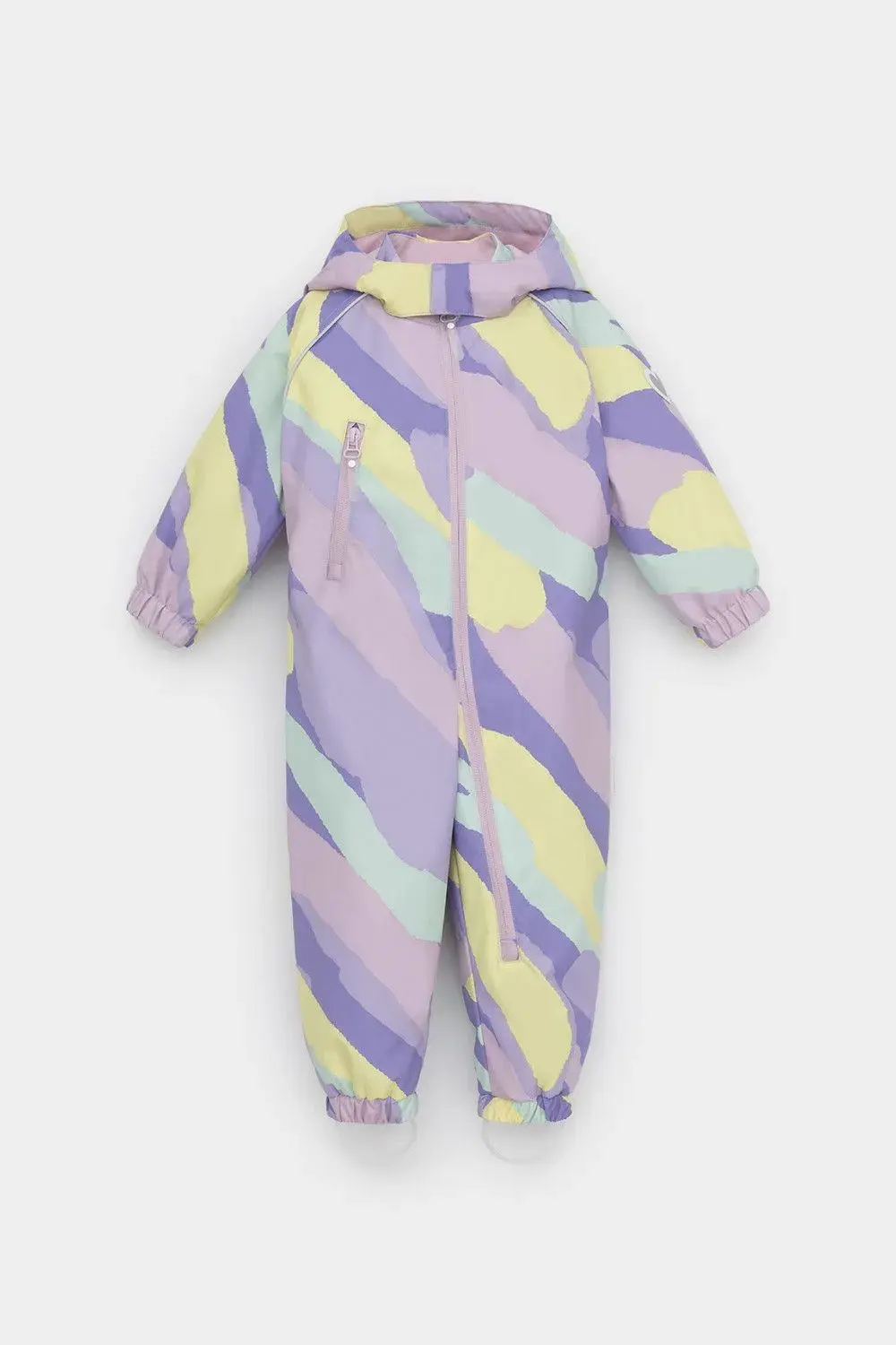 Ветровочный комбинезон ясельный из мембранной ткани с дополнительной тефлоновой обработкой. Данный вид обработки предохраняет изделие от загрязнения и лучше отводит влагу. Подклад из 100% хлопка. У изделия удлиненная молния для легкого одевания с защитой подбородка. Утяжка на капюшоне с потайными стопперами. По низу рукавов и брючин, а также на спинке изделия эластичная резинка для лучшего прилегания. Для фиксации комбинезона используются съемные силиконовые штрипки. В размерах 68-74, 74-80 функциональные отвороты на рукавах и брючинах. Во всех изделиях верхнего ассортимента для безопасности ребенка предусмотрены светоотражающие элементы.