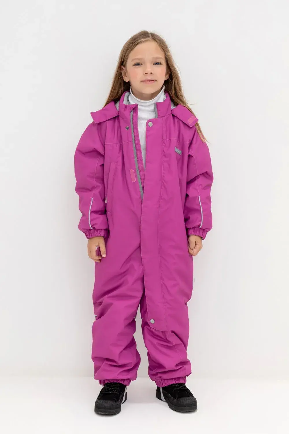 Демисезонный комбинезон для девочки с утеплителем SEE®: 120 г/м2. Выполнен из мембранной ткани с дополнительной тефлоновой обработкой. Данный вид обработки предохраняет изделие от загрязнения и лучше отводит влагу. Подклад из 100% полиэстра. У изделия удлиненная молния для легкого одевания с защитой подбородка. Ветрозащитная планка фиксируется на липучках и кнопках. Несъемный капюшон с эластичной резинкой и застежкой на липучку.По низу рукавов и брючин, а также на спинке изделия предусмотрена эластичная резинка для лучшего прилегания. Функциональный карман с молнией на груди. Для фиксации комбинезона используются съемные силиконовые штрипки. Во всех изделиях верхнего ассортимента для безопасности ребенка предусмотрены светоотражающие элементы.