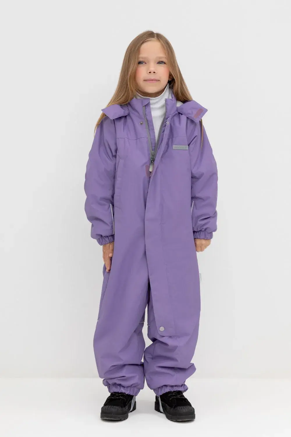 Демисезонный комбинезон для девочки с утеплителем SEE®: 120 г/м2. Выполнен из мембранной ткани с дополнительной тефлоновой обработкой. Данный вид обработки предохраняет изделие от загрязнения и лучше отводит влагу. Подклад из 100% полиэстра. У изделия удлиненная молния для легкого одевания с защитой подбородка. Ветрозащитная планка фиксируется на липучках и кнопках. Несъемный капюшон с эластичной резинкой и застежкой на липучку.По низу рукавов и брючин, а также на спинке изделия предусмотрена эластичная резинка для лучшего прилегания. Функциональный карман с молнией на груди. Для фиксации комбинезона используются съемные силиконовые штрипки. Во всех изделиях верхнего ассортимента для безопасности ребенка предусмотрены светоотражающие элементы.