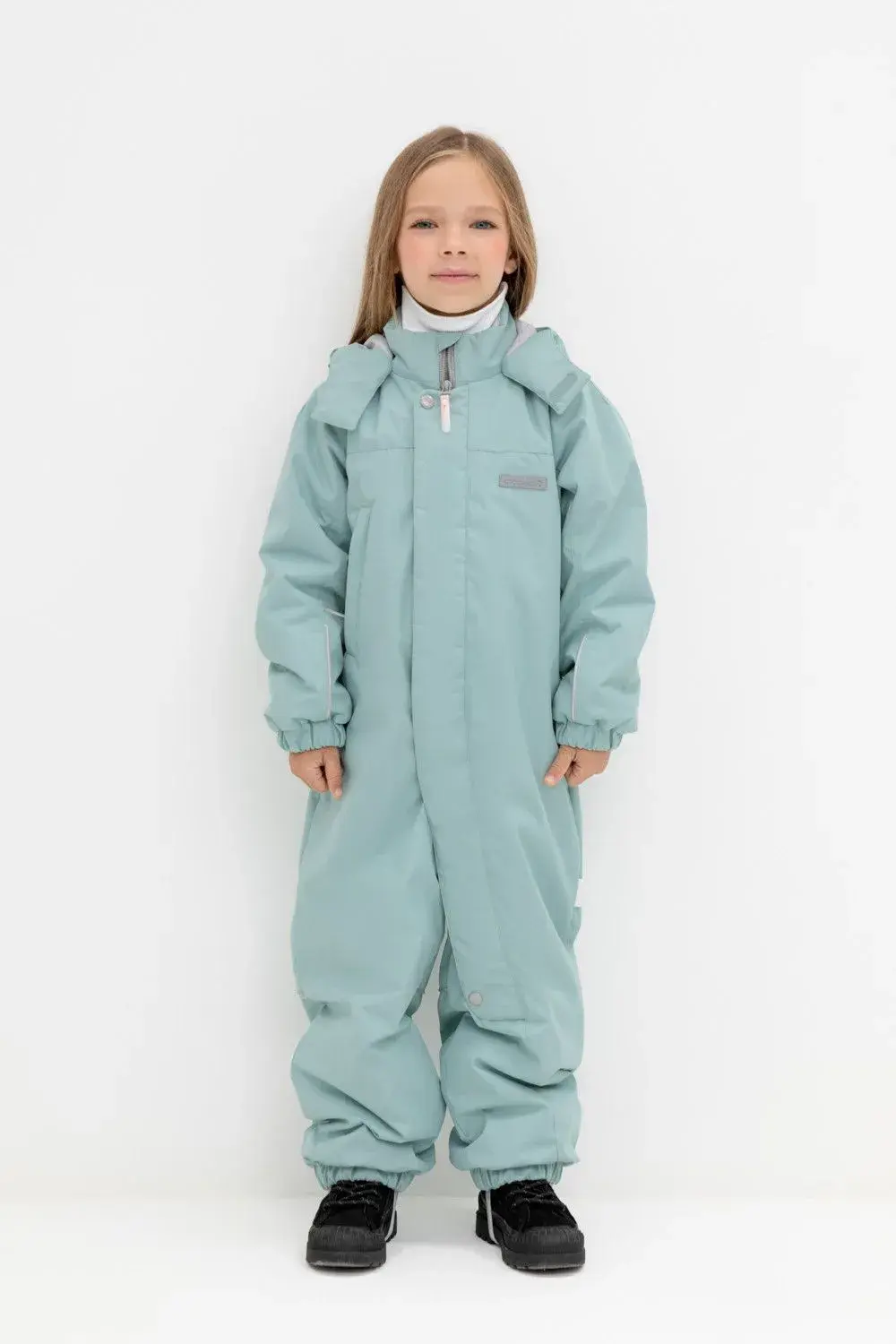 Демисезонный комбинезон для девочки с утеплителем SEE®: 120 г/м2. Выполнен из мембранной ткани с дополнительной тефлоновой обработкой. Данный вид обработки предохраняет изделие от загрязнения и лучше отводит влагу. Подклад из 100% полиэстра. У изделия удлиненная молния для легкого одевания с защитой подбородка. Ветрозащитная планка фиксируется на липучках и кнопках. Несъемный капюшон с эластичной резинкой и застежкой на липучку.По низу рукавов и брючин, а также на спинке изделия предусмотрена эластичная резинка для лучшего прилегания. Функциональный карман с молнией на груди. Для фиксации комбинезона используются съемные силиконовые штрипки. Во всех изделиях верхнего ассортимента для безопасности ребенка предусмотрены светоотражающие элементы.