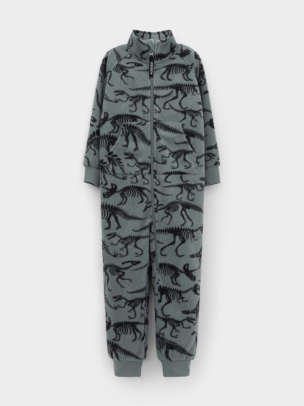 Флисовый комбинезон для мальчика с высоким воротником. Застёгивается на удлинённую молнию с мягкой защитой шеи и подбородка. Рукава и низ изделия на манжетах из трикотажа в рубчик. Эластичная резинка по спинке обеспечивает идеальную посадку. Спереди удобный карман-кенгуру. Оригинальная набивка выполнена из стойких гипоаллергенных текстильных красителей. Комбинезон сохраняет цвет и форму после многократных стирок.