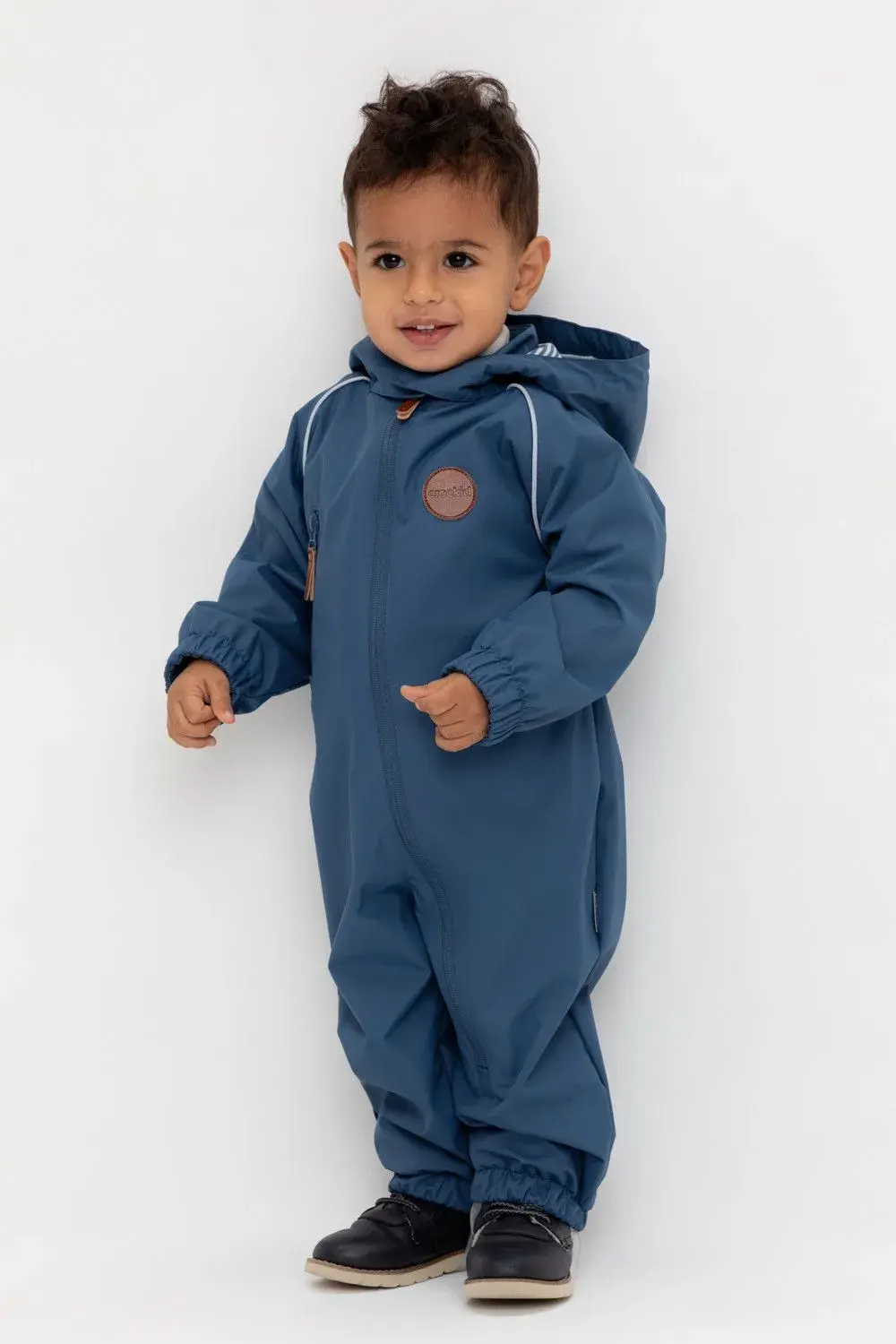 Ветровочный комбинезон ясельный из мембранной ткани с дополнительной тефлоновой обработкой. Данный вид обработки предохраняет изделие от загрязнения и лучше отводит влагу. Подклад из 100% хлопка. У изделия удлиненная молния для легкого одевания с защитой подбородка. Утяжка на капюшоне с потайными стопперами. По низу рукавов и брючин, а также на спинке изделия эластичная резинка для лучшего прилегания. Для фиксации комбинезона используются съемные силиконовые штрипки. В размерах 68-74 и 74-80 функциональные отвороты на рукавах и брючинах. Во всех изделиях верхнего ассортимента для безопасности ребенка предусмотрены светоотражающие элементы.