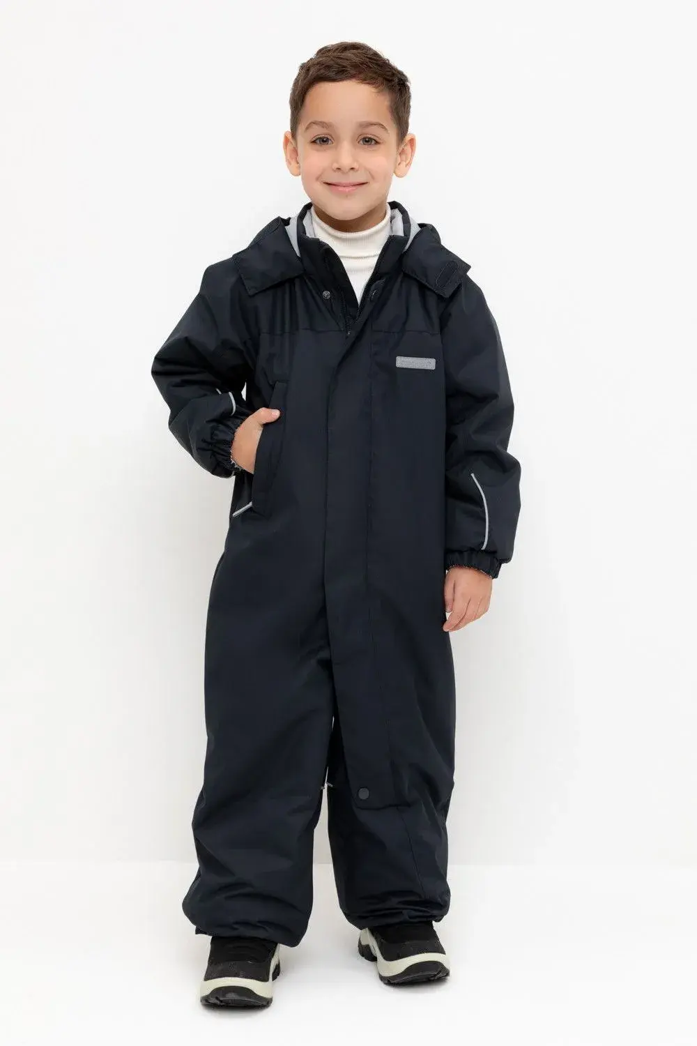 Демисезонный комбинезон для мальчика с утеплителем SEE®: 120 г/м2. Выполнен из мембранной ткани с дополнительной тефлоновой обработкой. Данный вид обработки предохраняет изделие от загрязнения и лучше отводит влагу. Подклад из 100% полиэстра. У изделия удлиненная молния для легкого одевания с защитой подбородка. Несъемный капюшон имеет эластичную резинку для лучшего прилегания. По низу рукавов и брючин эластичные манжеты. Функциональный карман с молнией на груди. Для фиксации комбинезона используются съемные силиконовые штрипки. Во всех изделиях верхнего ассортимента для безопасности ребенка предусмотрены светоотражающие элементы.