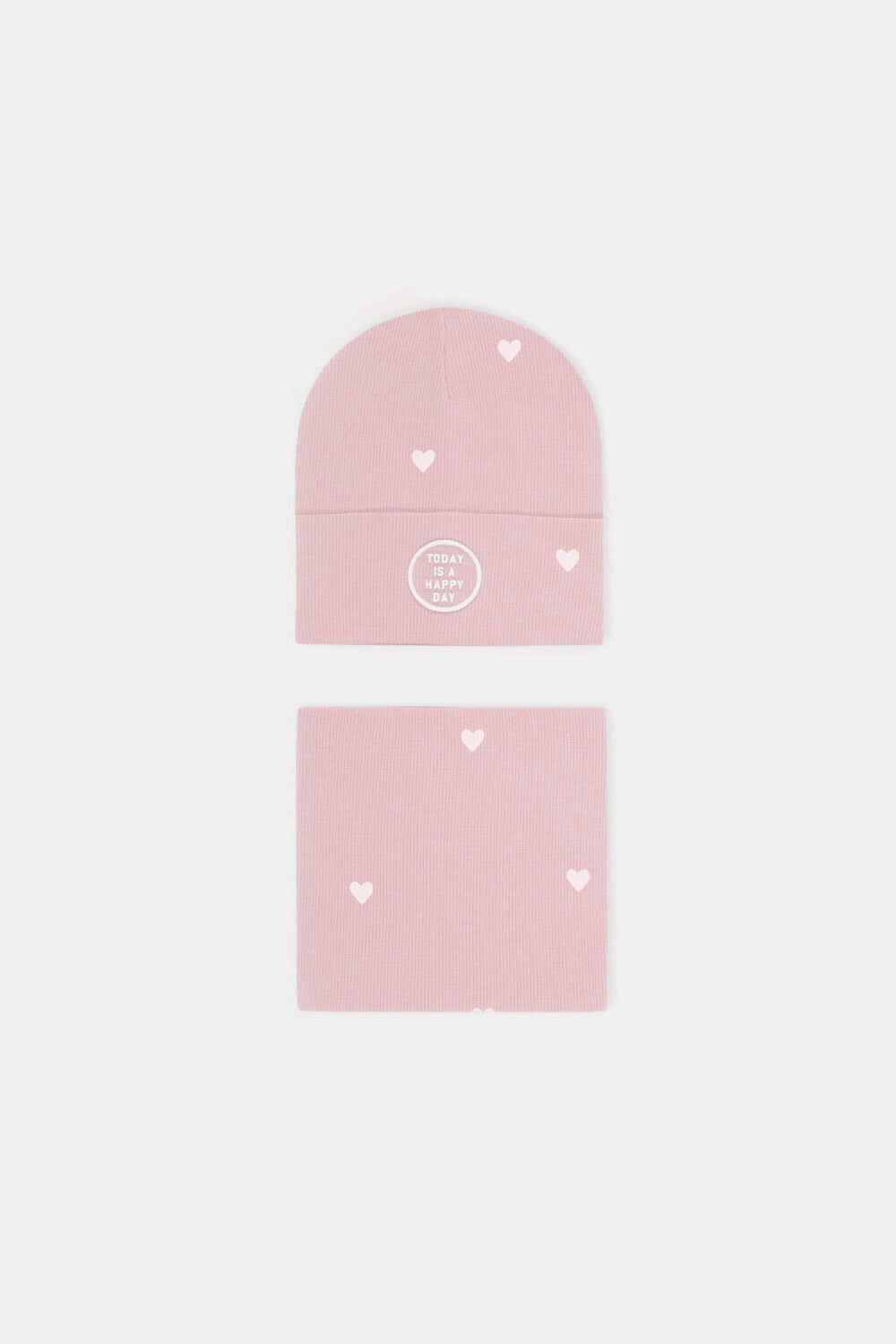 Комплект для девочки: шапка и снуд из хлопкового трикотажа в рубчик с добавлением эластана. Набивка выполнена из стойких гипоаллергенных красителей. Изделия хорошо тянутся, после многократных стирок сохраняют цвет и форму.